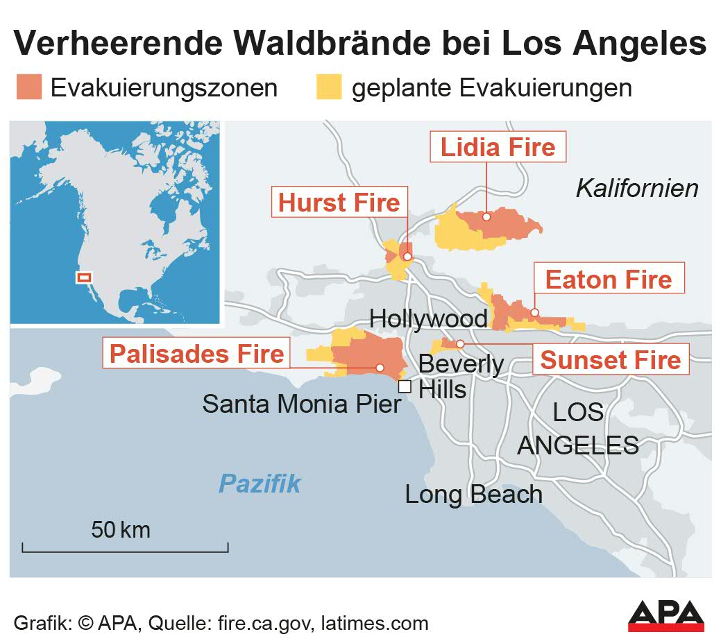 Doch nicht nur vor den Flammen müssen Menschen, die aus ihren Häusern geflohen sind, Angst haben: Die Feuerkatastrophe rief den Behörden zufolge auch Kriminelle auf den Plan. Mindestens 20 Verdächtige seien bisher im Zusammenhang mit Plünderungen festgenommen worden, sagte Kathryn Barger vom Verwaltungsbezirk Los Angeles. Barger nannte die Plünderer "Opportunisten" und fügte vor Journalisten hinzu: "Ich werde nicht tatenlos zusehen und zulassen, dass eine bereits traumatische Erfahrung noch schlimmer wird." Die Polizei erwägt Ausgangssperren.