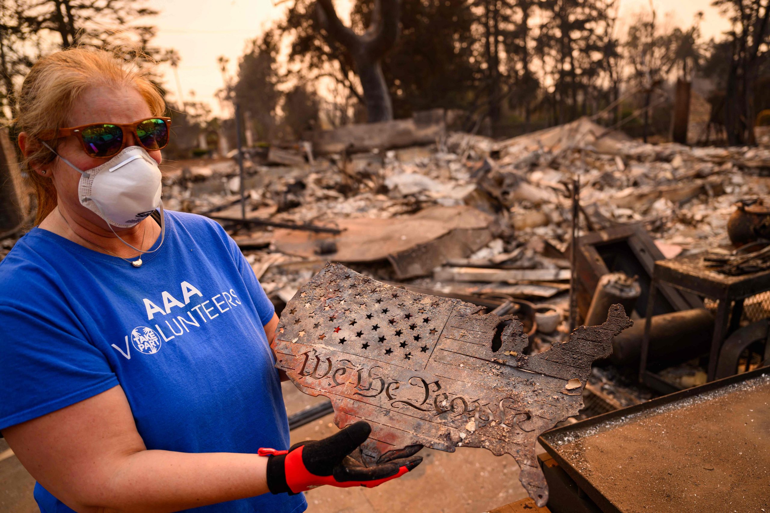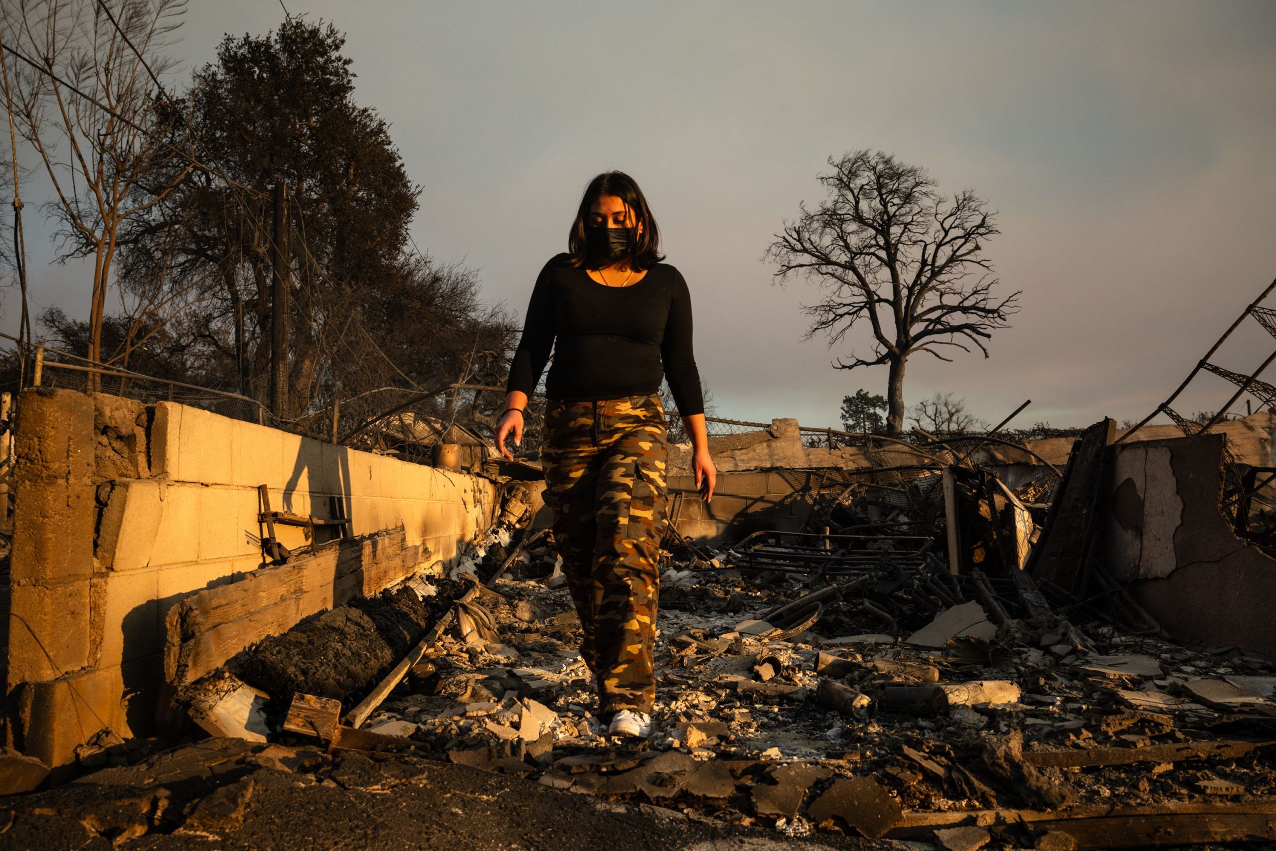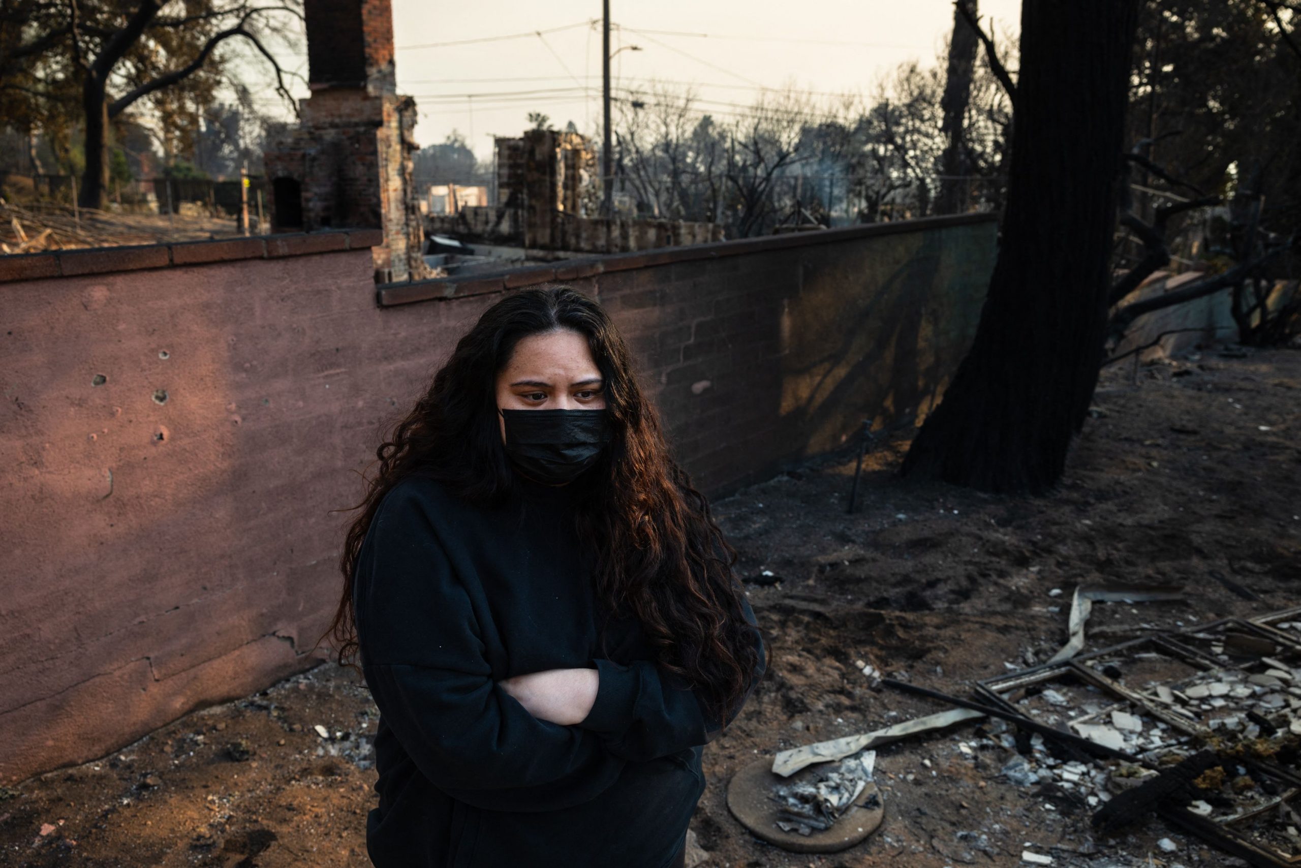 ©Danielle Maki reacts while viewing the remains of her brother's home burned in the Eaton fire in the Altadena area of Los Angeles county, California on January 9, 2025. Massive wildfires that engulfed whole neighborhoods forcing over 100,000 people to flee their homes and claiming at least five lives in Los Angeles remained totally uncontained on January 9, authorities said, as US National Guard soldiers readied to hit the streets to help quell disorder. (Photo by JOSH EDELSON / AFP)
