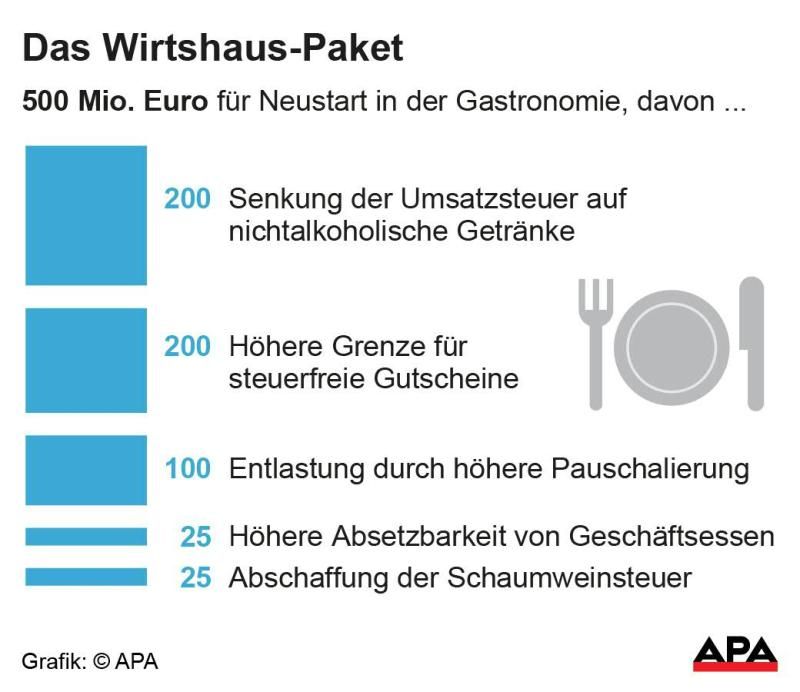 - Wirtshäuser dürfen auf nicht-alkoholische Getränke vom 1. Juli bis 31. Dezember 2020 10 Prozent Mehrwertsteuer verrechnen statt 20 Prozent. Ausdrücklich sollen sie die Speisekarten aber unverändert lassen, die Steuersenkung soll ihnen und nicht den Kunden zugutekommen. Die Entlastung soll 200 Mio. Euro betragen.