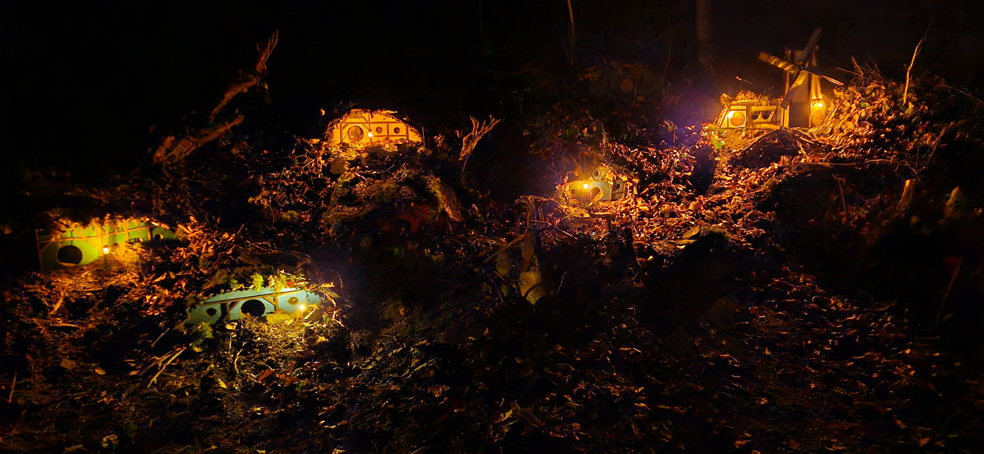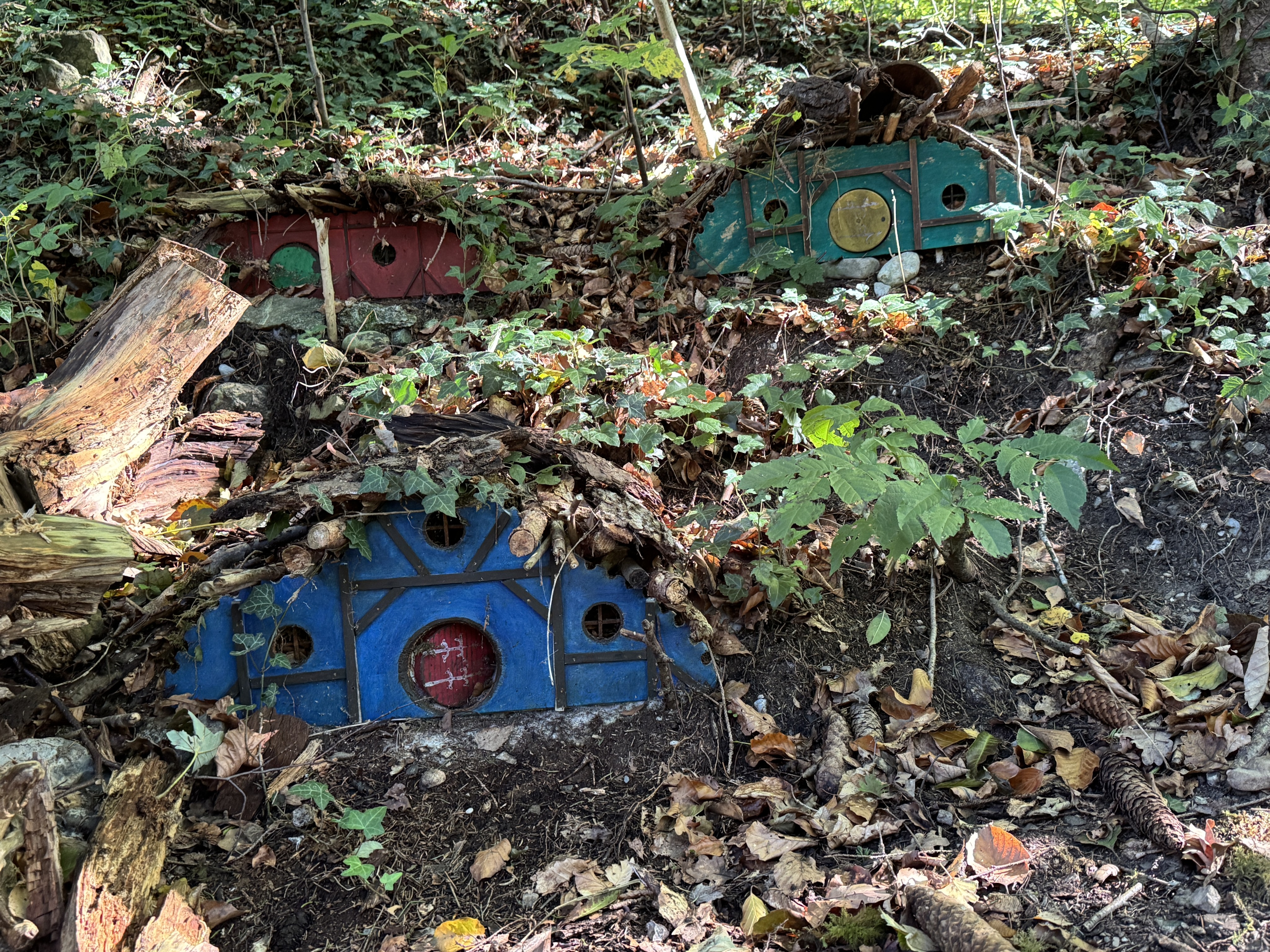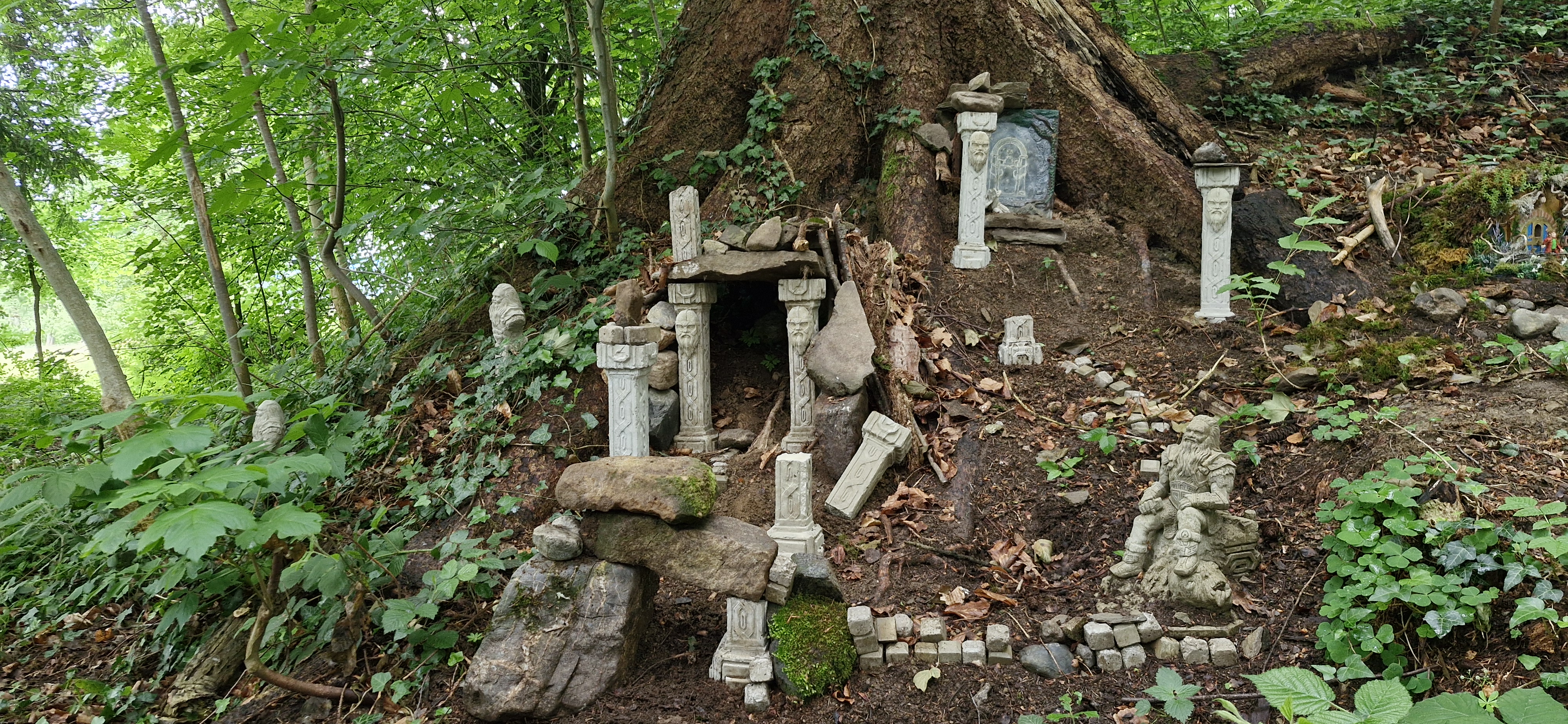 "Wir haben hier mit den Kindern Häuser erstellt", erzählt er. 13 kleine Häuschen, eine Windmühle, Säulen, Zwergenskulpturen – alles aus Ästen, Moos, Rinde und Steinen gebaut.