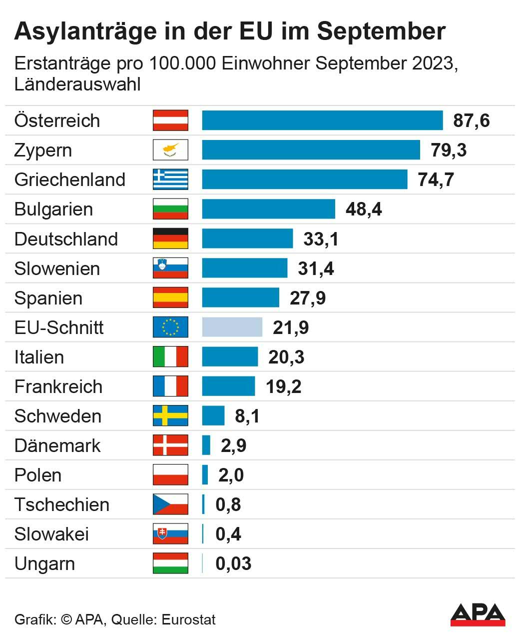 Im September 2023 haben 98.240 Menschen in einem der 27 EU-Länder erstmals um Asyl angefragt. Das sind zehn Prozent mehr als im September 2022 (89.370), wie die europäische Statistikbehörde Eurostat am Donnerstag mitteilte. Österreich verzeichnete im September 2023 die höchste Anzahl an Erstanträgen pro Kopf (87,6 Antragsteller pro hunderttausend Einwohner), gefolgt von Zypern (79,3). Bei unbegleiteten Minderjährigen lag Österreich EU-weit an dritter Stelle.