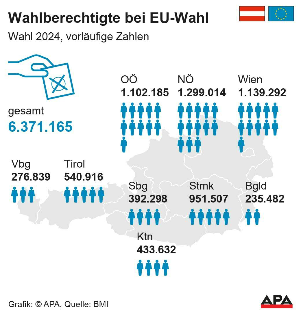 Insgesamt gibt es laut den Angaben der Wahlbehörden der neun Bundesländer 6.371.165 Wahlberechtigte bei der EU-Wahl 2024 in Österreich. Darunter befinden sich 44.680 Auslandsösterreicher und 45.091 Bürger der Europäischen Union.
