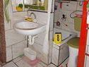 Das karge Bad mit dem alten Alibert-Schrank und einem Joghurtbecher zum Zähneputzen zeigt gespenstisch, dass hier tatsächlich einmal Menschen ihre Kindheit verbringen mussten. Kleine lächelnde Zeichentrickfiguren, offenbar selbstgemalte Sterne und ein aufgestellter Spielzeugelefant wirken angesichts des Ausmaßes des Schreckens in den Räumlichkeiten aber eher anklagend als trostspendend.