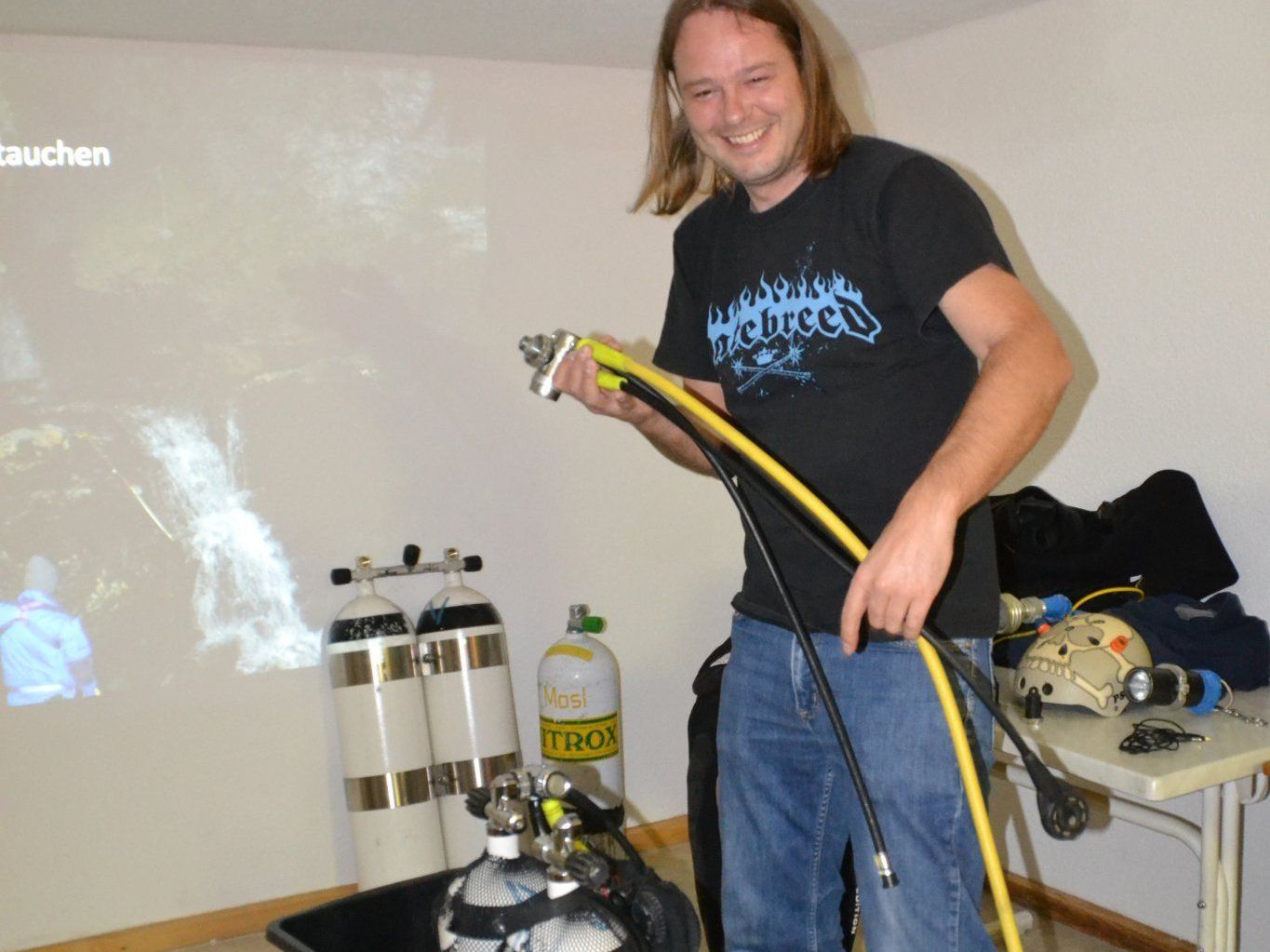 Die 30 Jugendlichen, die zum Vortrag von Klaus Moosbrugger „Faszination Höhlentauchen“ kamen, staunten nicht schlecht als Klaus mit einem Teil seiner Ausrüstung zum Treff anreiste. Auf gekonnte Art und jugendlichem Stil verstand es Klaus von der ersten Minute an die jugendlichen Zuhörer zu begeistern und seine Begeisterung für diese „Sportart“ zu schildern. Nach Wissenswertem über die Entstehung der Höhlen sowie Biographien über zwei Pioniere des Höhlentauchens erläuterte Klaus auch seinen persönlichen und höchst interessanten Zugang zum Höhlentauchen, das anschließend mit einer PowerPoint Präsentation und Kurzfilmen sowie vielen Fragen der Jugendlichen abgeschlossen wurde. Die Jugendlichen zeigten ihre Begeisterung mit einem tosenden Applaus.