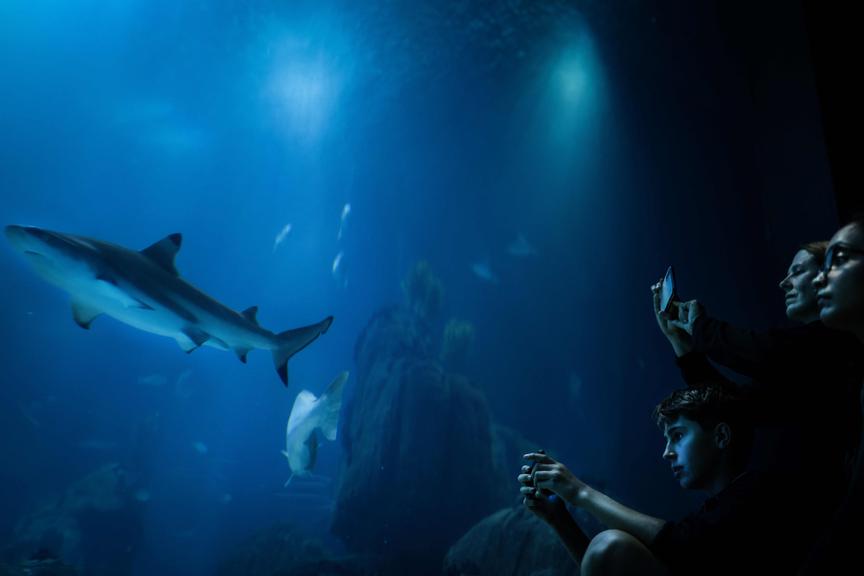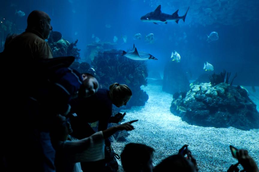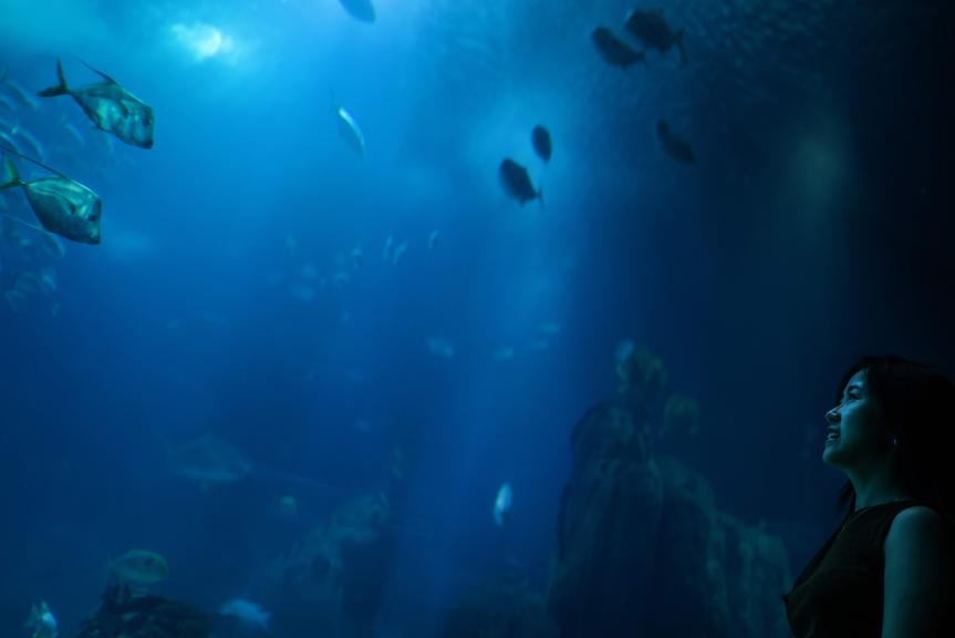 Etwa 100 verschiedene Arten – darunter Haie, Rochen, Barrakudas und Mondfische – leben im Hauptbecken. Insgesamt umfasst das Ozeanarium rund 450 Arten mit etwa 16.000 Individuen. Die Ausstellung ist so konzipiert, dass Besucher die Vielfalt der Meere aus unterschiedlichen Perspektiven beobachten können – ein intensives Erlebnis für Groß und Klein.