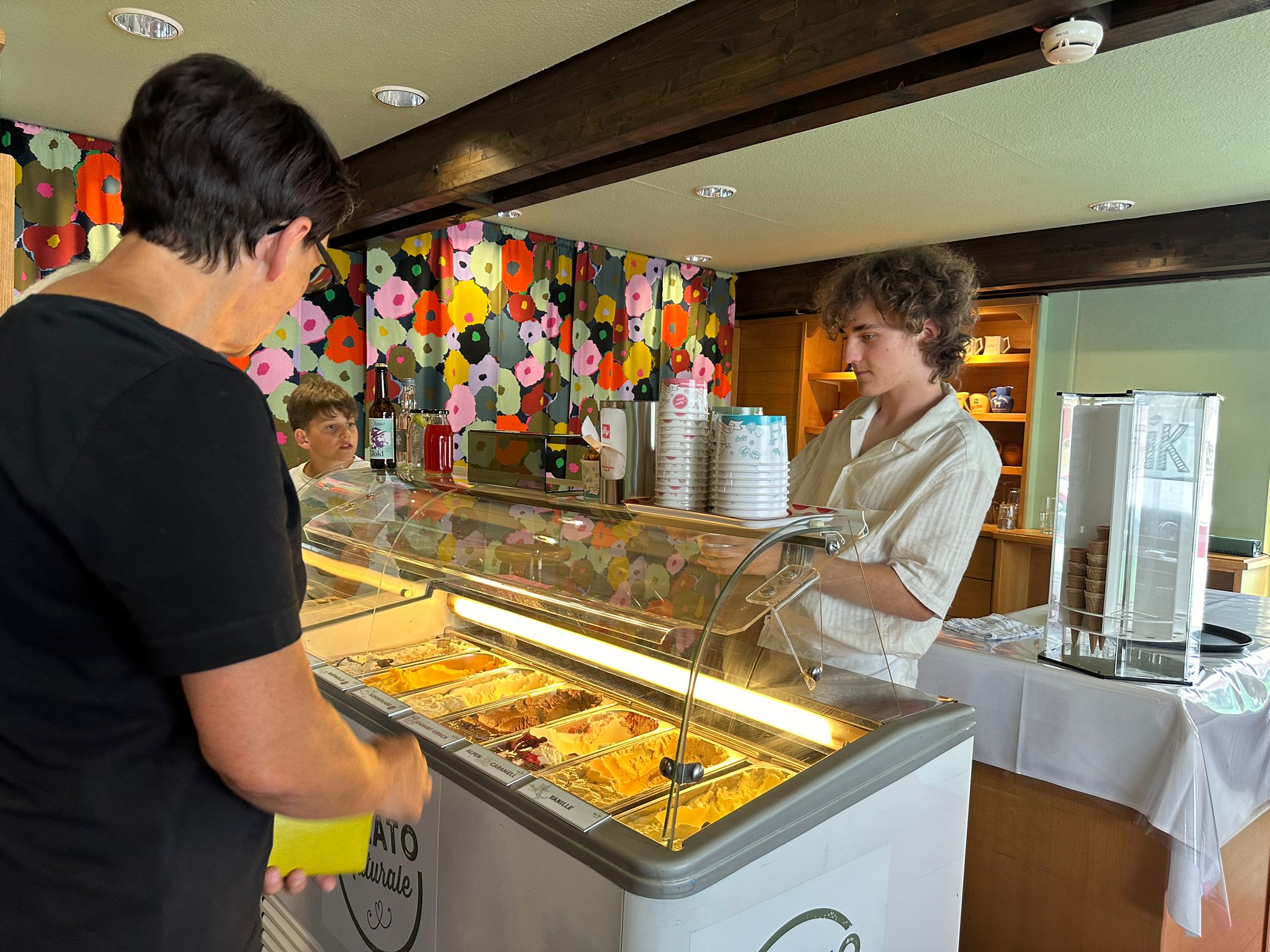 Die Führung der Eisdiele überlässt Dietmar Nußbaumer der jungen Generation. "Der Chef ist Kaspar (17), ein Neffe von mir. Er hat jetzt grade Ferien", erklärt er VOL.AT. Später wird er von Laura ersetzt. "Die zwei Assistenten sind Oskar (12) und Max (10)" Das sind die Söhne des Wirts und seiner Frau Helene. Das Team des Hotels Krone hat sich mit der Eisdiele "Dolce Vita" zusammengetan. Mit Andrew Nussbaumer wurde eine gute Vereinbarung getroffen. "Es war auch wichtig für uns, dass am Dorfplatz weiterhin Leben bleibt", betont der Gastgeber. "Jetzt sind so viele Leute, so viele Jahre bei Manfred aus und ein gegangen." Die Wochen nach der Trafik-Schließung habe etwas gefehlt. Leute sollen sich treffen können, ein Eis essen und sich unterhalten. "Aus Tabak-Trafik wird Eis-Trafik", meint Nußbaumer.