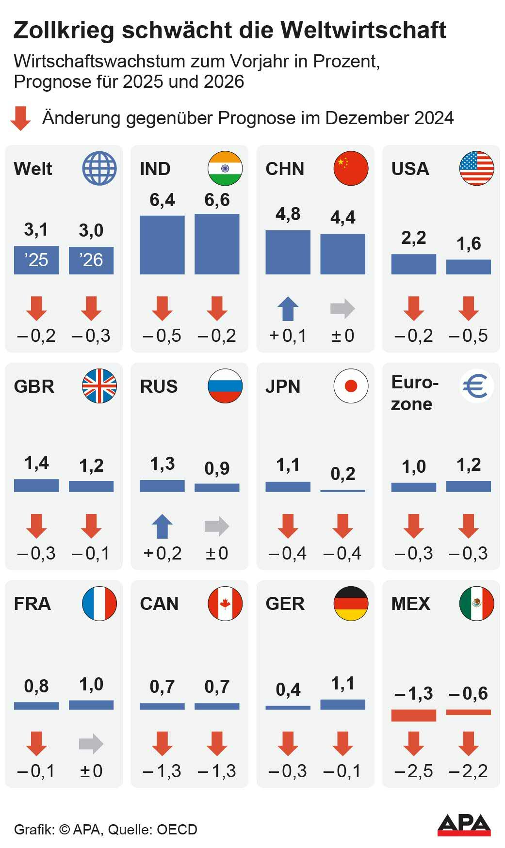 Die OECD hat die Wachstumsprognose für die Eurozone für 2025 am Montag von 1,3 auf 1,0 Prozent gesenkt. Es gehe "weiter seitwärts", sagte Felbermayr dazu. Einen spürbaren Aufschwung gebe es erst bei Wachstumsraten von 2 bis 2,5 Prozent. Neue Konjunkturprognosen für die Jahre 2025 und 2026 in Österreich veröffentlichen das Wirtschaftsforschungsinstitut Wifo und das Institut für Höhere Studien (IHS) Ende März.