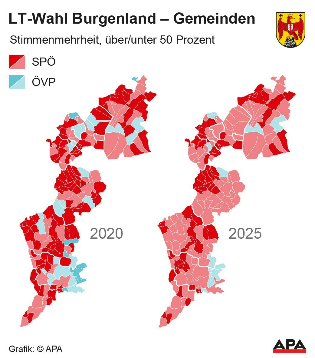 Trotz starker Zugewinne konnte die FPÖ bei der Landtagswahl im Burgenland in keiner Gemeinde den ersten Platz erringen, während die SPÖ fast überall dominierte. Die politische Landkarte im Burgenland ist somit anders gefärbt, als bei der Nationalratswahl im vergangenen Herbst.