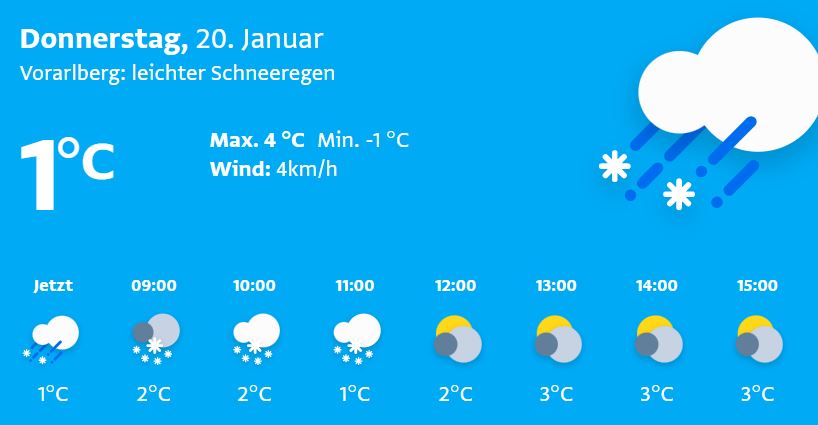 Samstag: Das trübe, nass-kalte und auf den Bergen windige Wetter hält auch zum Beginn des Wochenendes noch an. Tiefstwerte: -7 bis -2 Grad, Höchstwerte: 0 bis 2 Grad. Sonntag: Voraussichtlich bleibt es im ganzen Land trocken. Während vom Bodensee bis in den Bregenzerwald hinein noch dichte Wolken liegen, kann sich die Sonne nach Süden zu tendenziell schon besser durchsetzen. Tiefstwerte: -5 bis -1 Grad, Höchstwerte: 2 bis 4 Grad. Montag: Von Oberschwaben her können noch dichtere Wolken ins Unterland drücken, in Summe dürfte es aber ein freundlicher Wintertag werden.