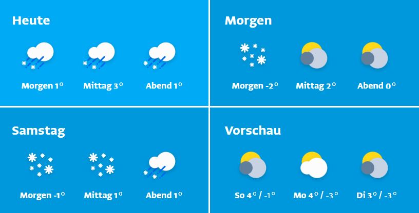 Im Rheintal und am Bodensee mischt sich eventuell etwas Regen dazu. Es ist winterlich kalt, dazu weht lebhafter Wind aus West bis Nordwest. Tiefstwerte: -4 bis 1 Grad. Höchstwerte: -1 bis 3 Grad.