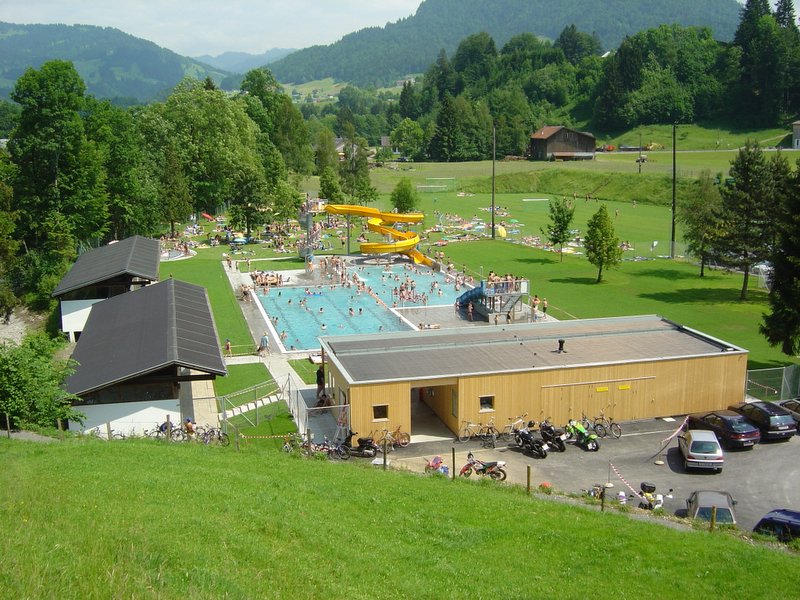 Familiäre Atmosphäre, viel Grün und eine 60-Meter-Rutsche zeichnen das kleine, gepflegte Freibad im Bregenzerwald aus.