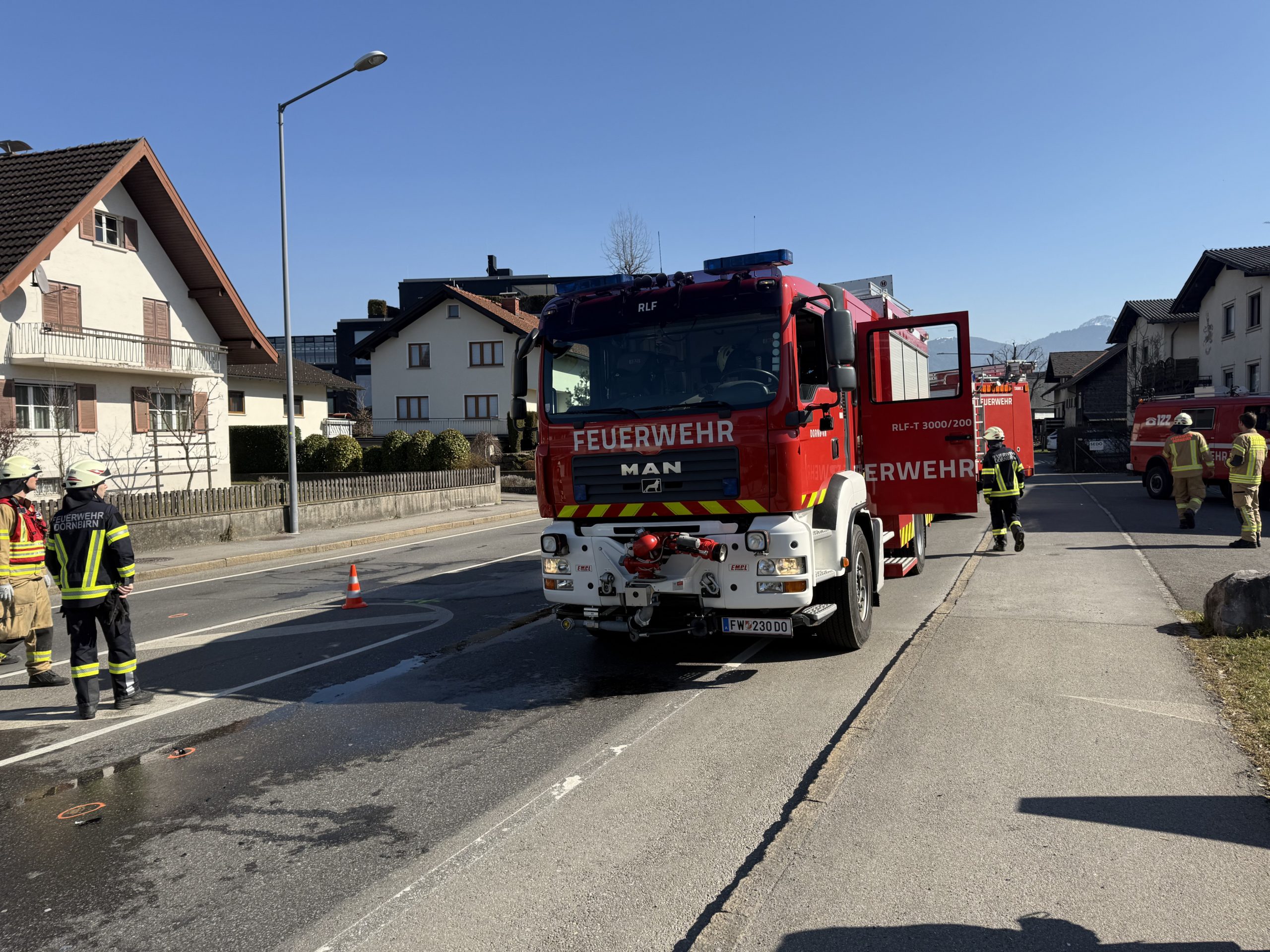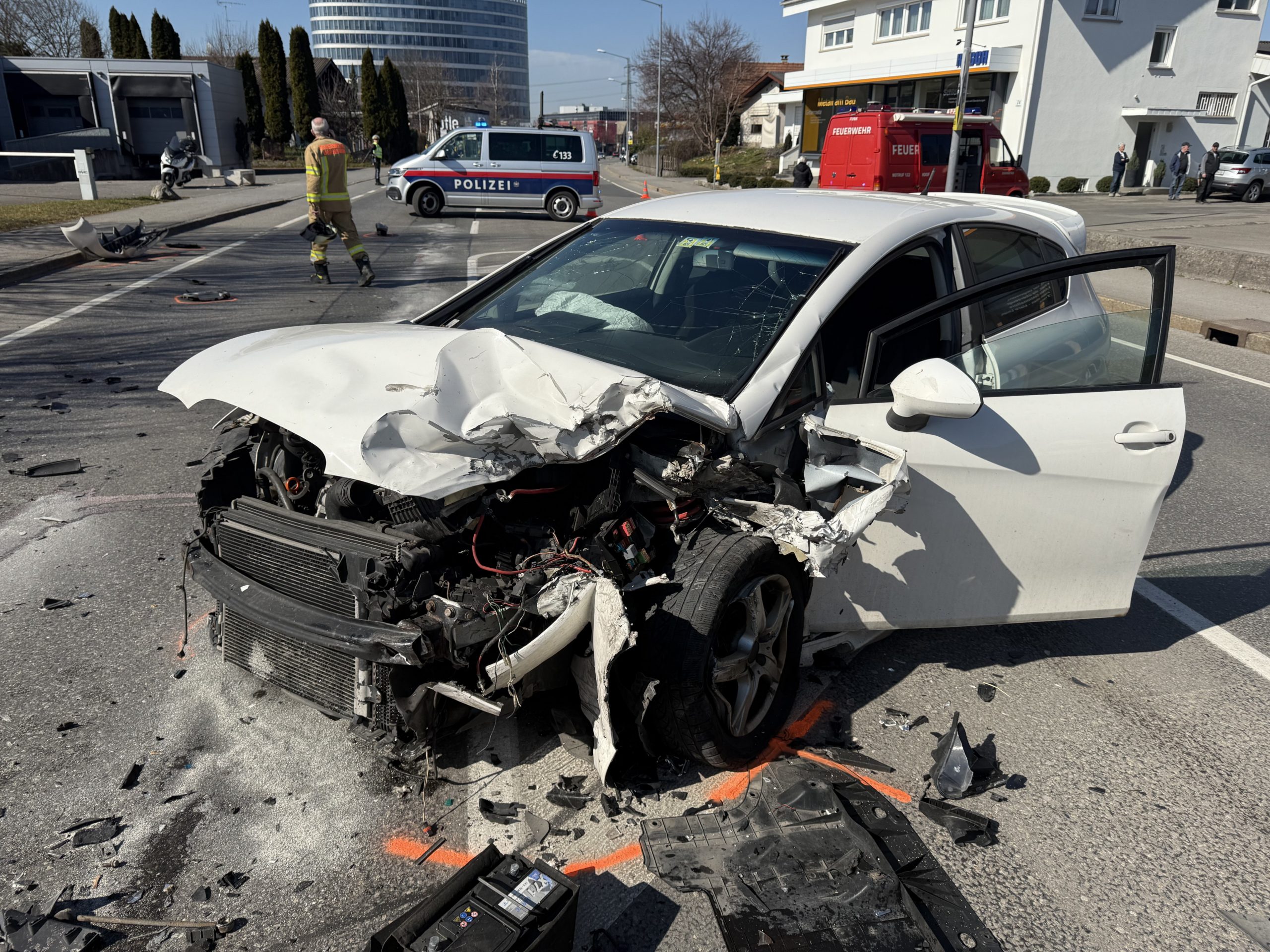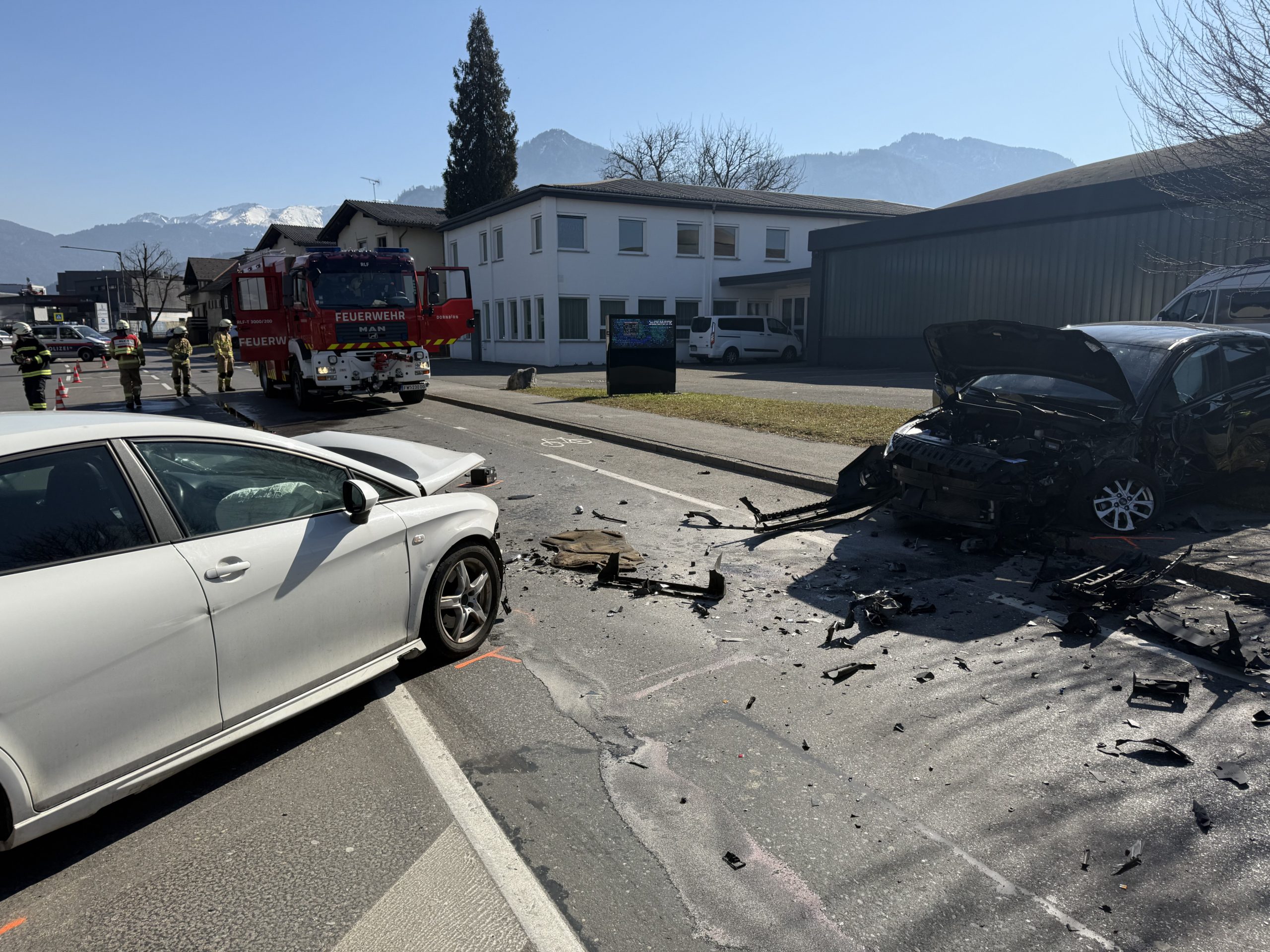 Die Feuerwehr Dornbirn wurde umgehend alarmiert, um die Unfallstelle abzusichern und austretende Flüssigkeiten zu binden, die durch den Frontalzusammenstoß verursacht wurden. Gleichzeitig war das Rote Kreuz mit insgesamt vier Fahrzeugen und acht Einsatzkräften vor Ort.