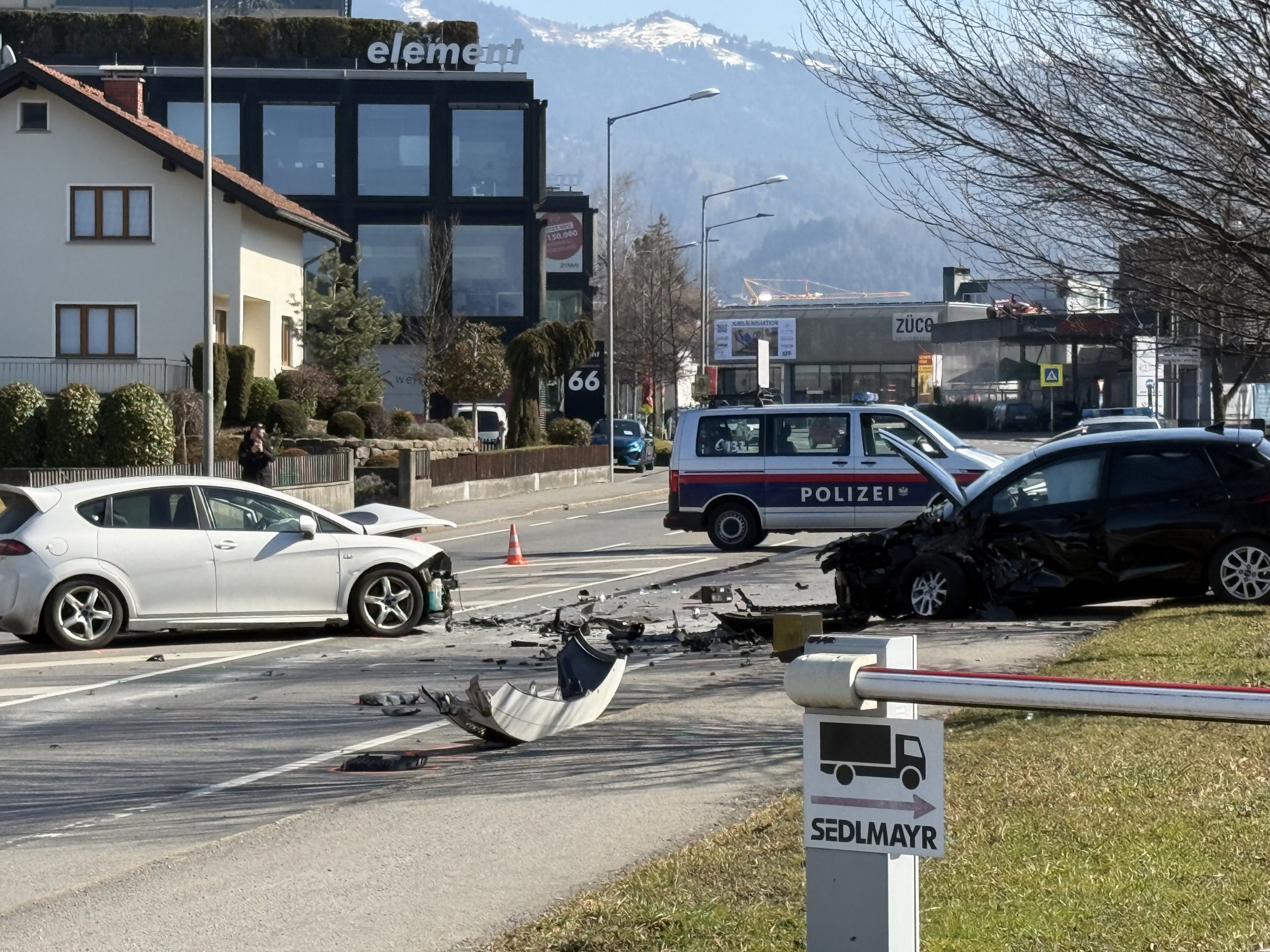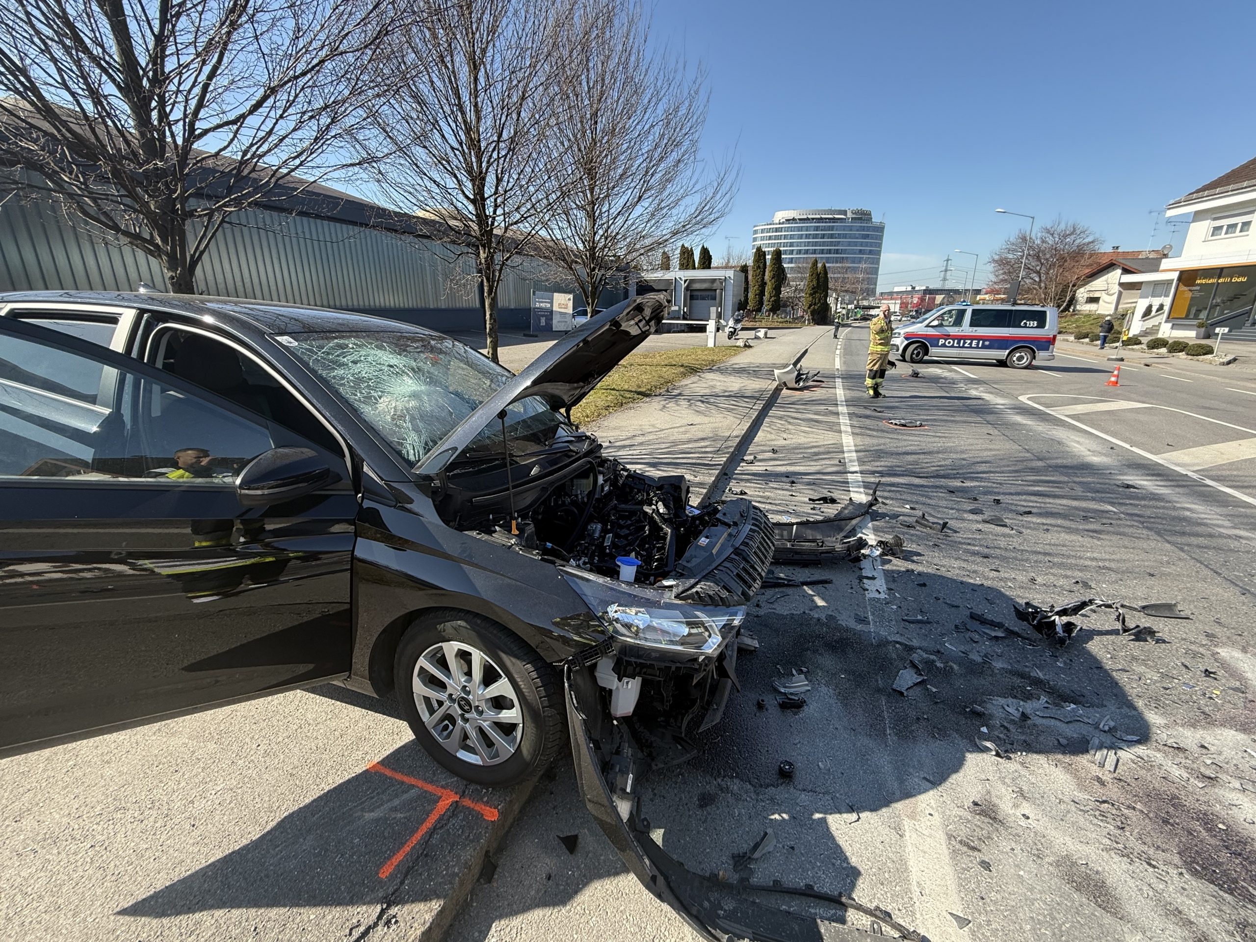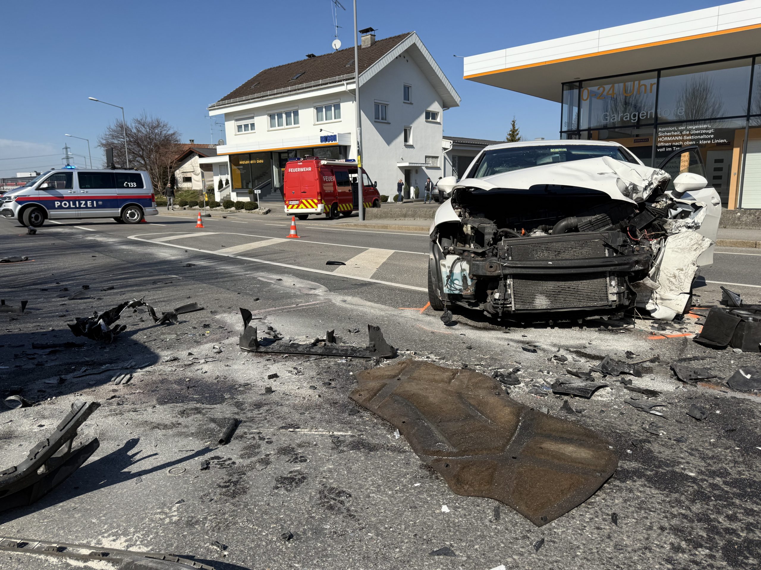 Die Feuerwehr Dornbirn wurde umgehend alarmiert, um die Unfallstelle abzusichern und austretende Flüssigkeiten zu binden, die durch den Frontalzusammenstoß verursacht wurden. Gleichzeitig war das Rote Kreuz mit insgesamt vier Fahrzeugen und acht Einsatzkräften vor Ort.