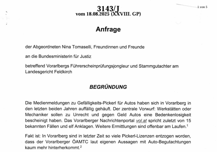 Was als regionale Enthüllung begann, ist inzwischen ein bundespolitisches Thema. Die "Vorarlberger Nachrichten" hatten in den vergangenen Tagen hinterfragenswerte Missstände bei Fahrprüfungen in Vorarlberg aufgedeckt – nun berichten auch Medien wie "Der Standard" und die ZiB2 österreichweit darüber. Und auch im Parlament in Wien ist die Causa angekommen: Die grüne Nationalratsabgeordnete Nina Tomaselli hat eine parlamentarische Anfrage an die Justizministerin eingebracht.