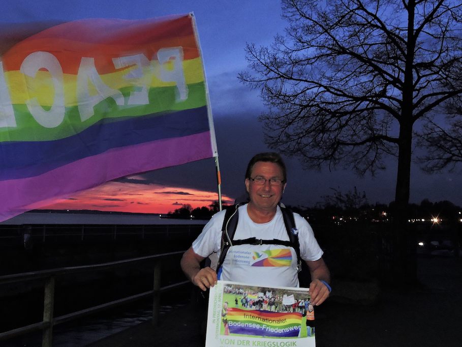 Thamm und sein Gefährte hat sich den 340-Kilometer-Fussmarsch auch als Werbetour für den am Ostermontag in Bregenz stattfindenden Ostermarsch/Friedensweg 2018 ausgedacht. In drei 100-km-Etappen will er mit seinen Gefährten_innen den Bodensee umrunden. Wichtiger aber ist: „Wir setzen ein Zeichen, dass wir für Frieden und Abrüstung bereit sind, an unsere Grenzen zu gehen“, sagt der engagierte Friedensfussgänger und lädt jede_n ein, ihn ein Stück des Weges zu begleiten. „Der Friede sei mit ihnen“ kann man Thamm und seinem Gefährten“ in diesen Tagen nur wünschen und auch all jenen, ,die sich für eine zeitweilige Begleitung der beiden Friedensmarschierer entschließen können.