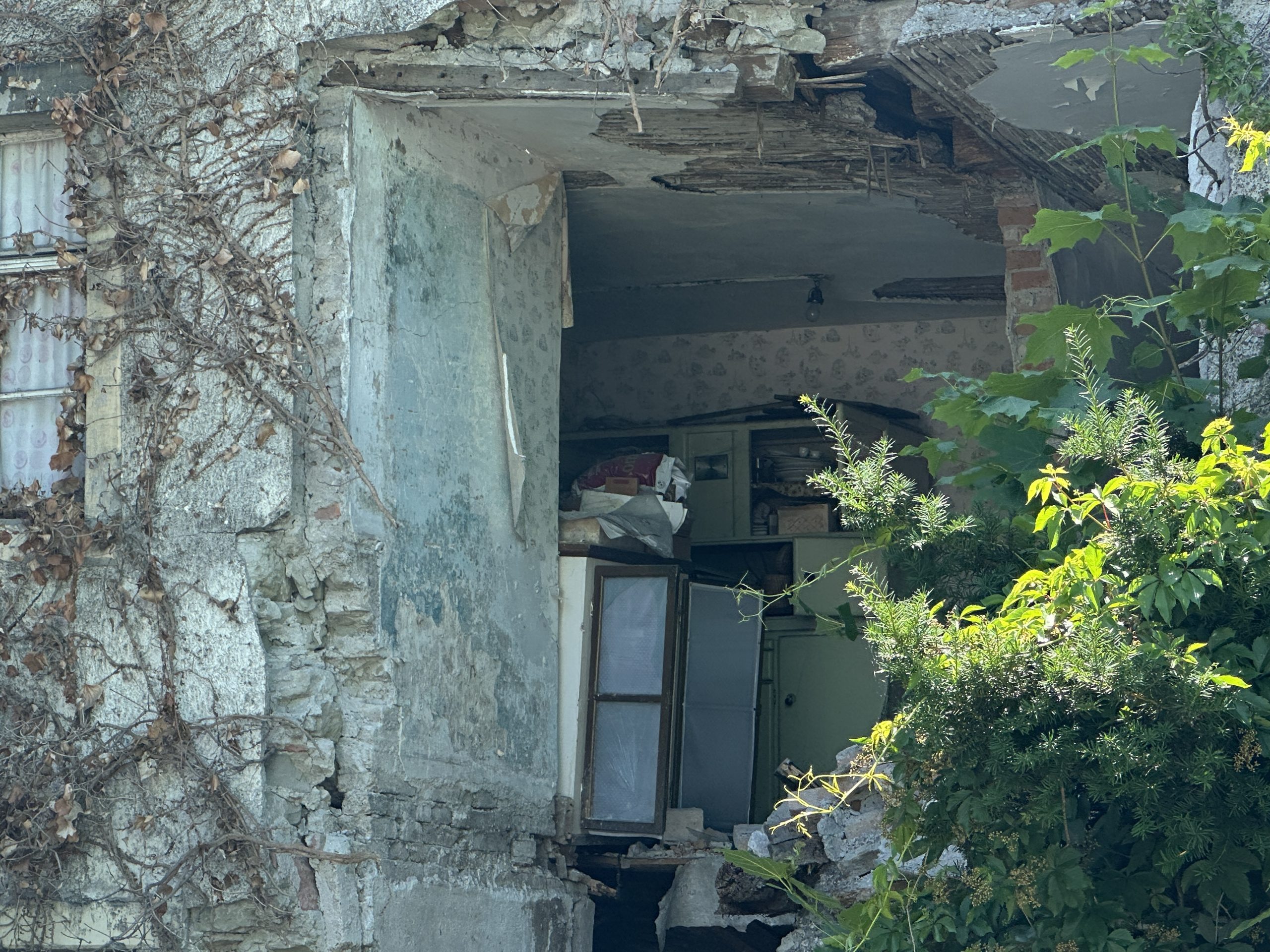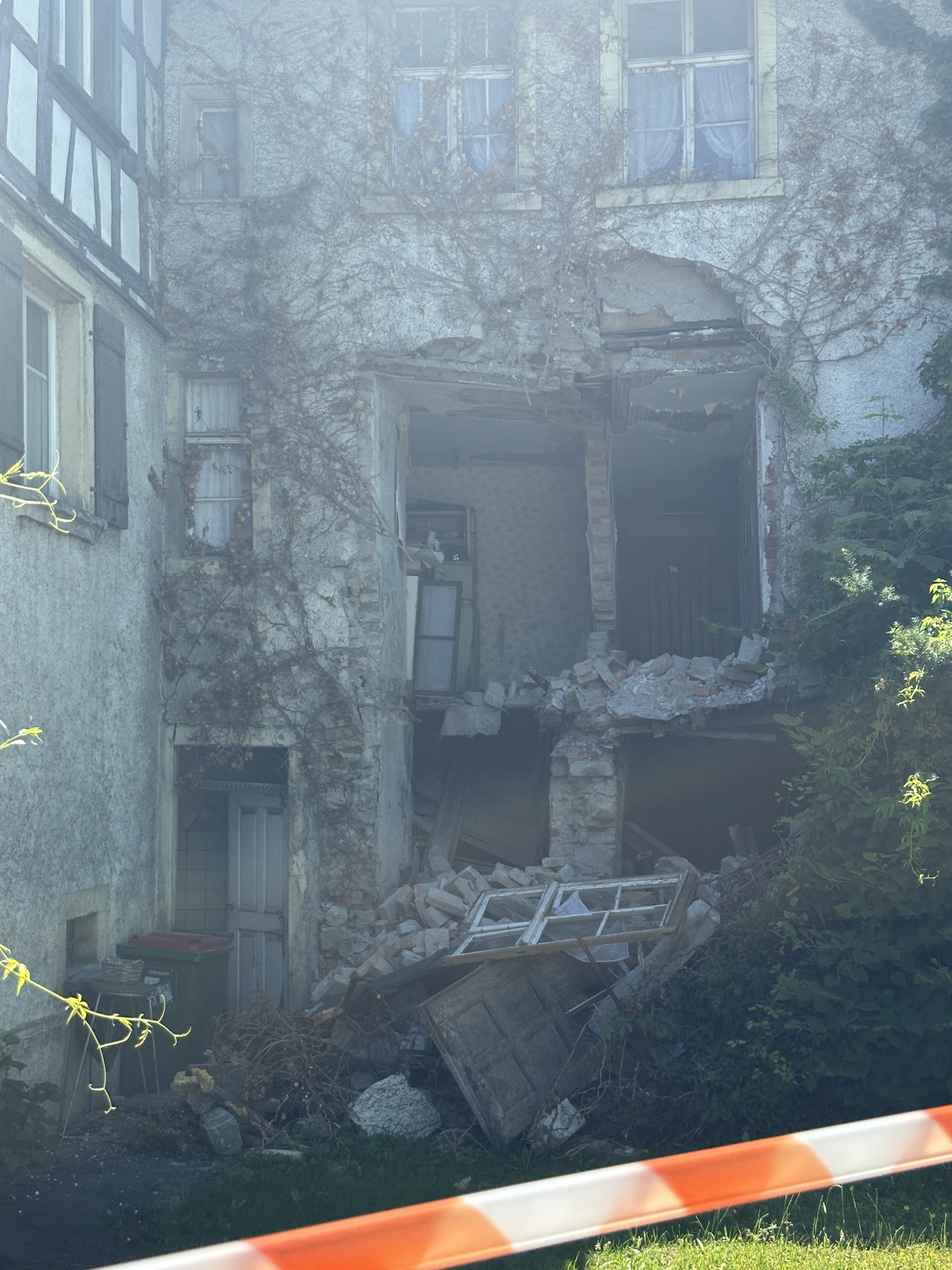 Ein erneuter VOL.AT-Lokalaugenschein zeigt massive Schäden an der Fassade und weiter herabgestürzte Mauerteile. Durch ein großes Loch ist der Blick ins Gebäude auf die dort stehenden Möbel mittlerweile möglich. Neu sind auch die rot-weißen Absperrbänder, die vor dem Gebäudeteil gespannt sind. Hinweisschilder auf die Einsturzgefahr sind bereits seit längerer Zeit am Gebäude angebracht.