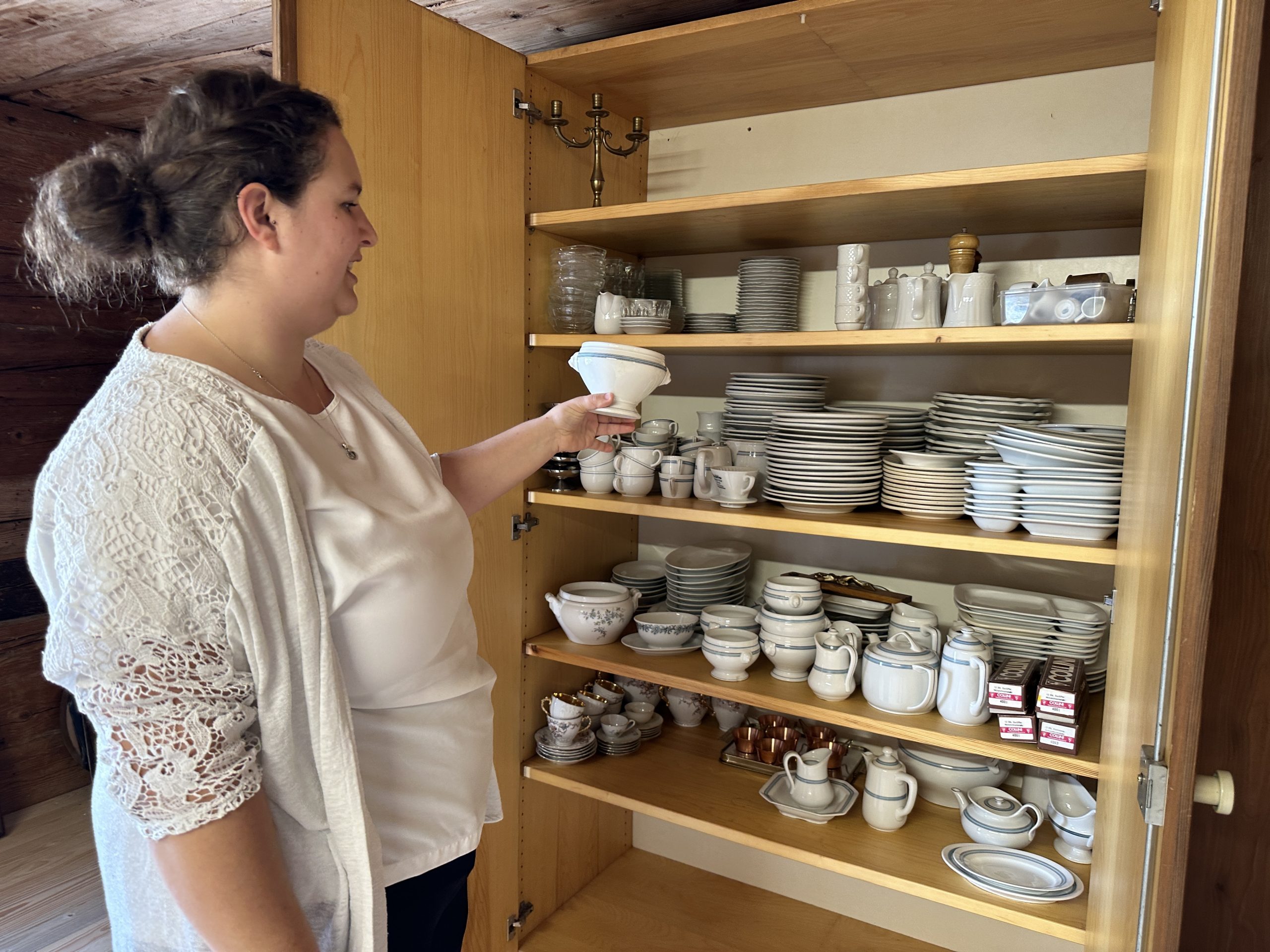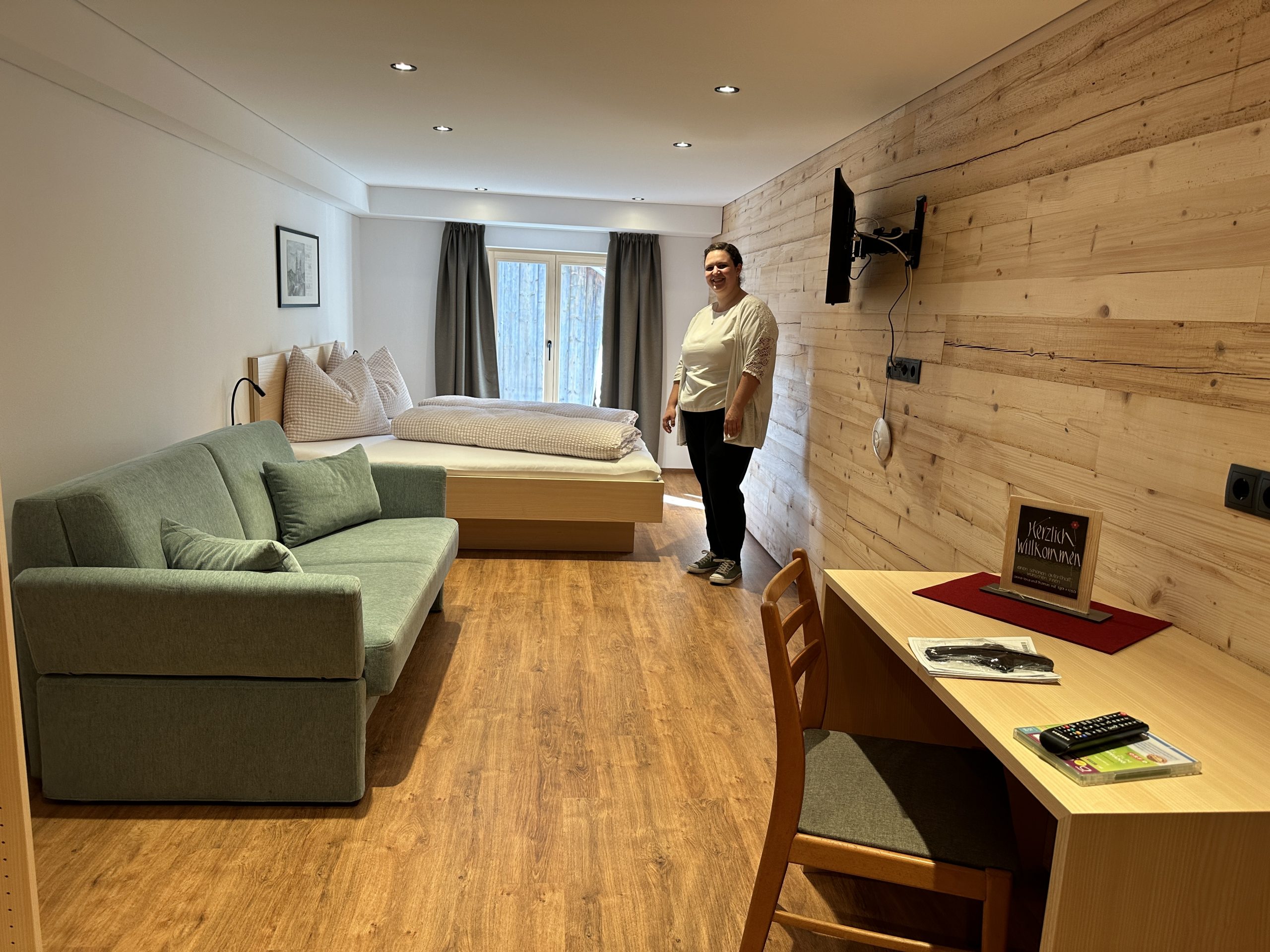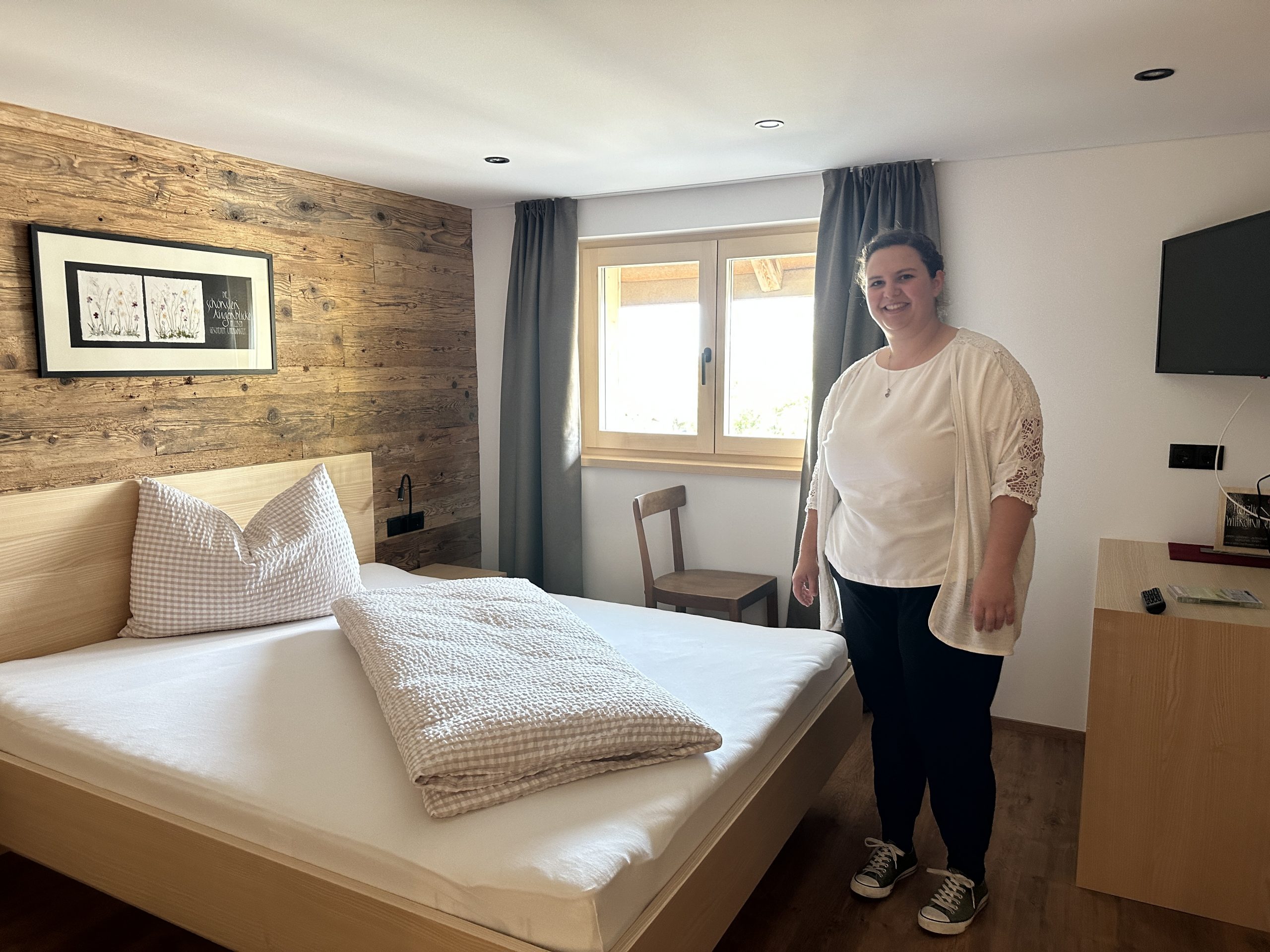 Eines der sechs Zimmer ist ein Familienzimmer, der Rest sind Ein- und Zweibettzimmer. "Im Familienzimmer gibt es ein ausziehbares Schlafsofa", erklärt Anna-Lena Moosbrugger. Es ist somit geeignet für zwei Erwachsene und zwei Kinder. "Das ist auch das Zimmer, das meinem Vater gewidmet wurde. Es heißt dann auch wirklich auch Christoph-Zimmer", verdeutlicht sie. Auch die Namen der anderen vorhergehenden Wirte finden sich im Haus wieder: Es gibt sechs Zimmer und sechs Generationen, wie die Wirtin betont. Der schöne alte Saal im Obergeschoss heißt nicht umsonst "Ilga-Saal": "Der ist unserer älteren Tochter gewidmet", verrät Moosbrugger. "Und aber auch genauso der Schwester vom Opa, die viele Jahre hier gearbeitet hat." "Rosa's Stüble" im Eingangsbereich, eine kleine gemütliche Stube, ist nach der zweiten Tochter der Wirtin benannt.