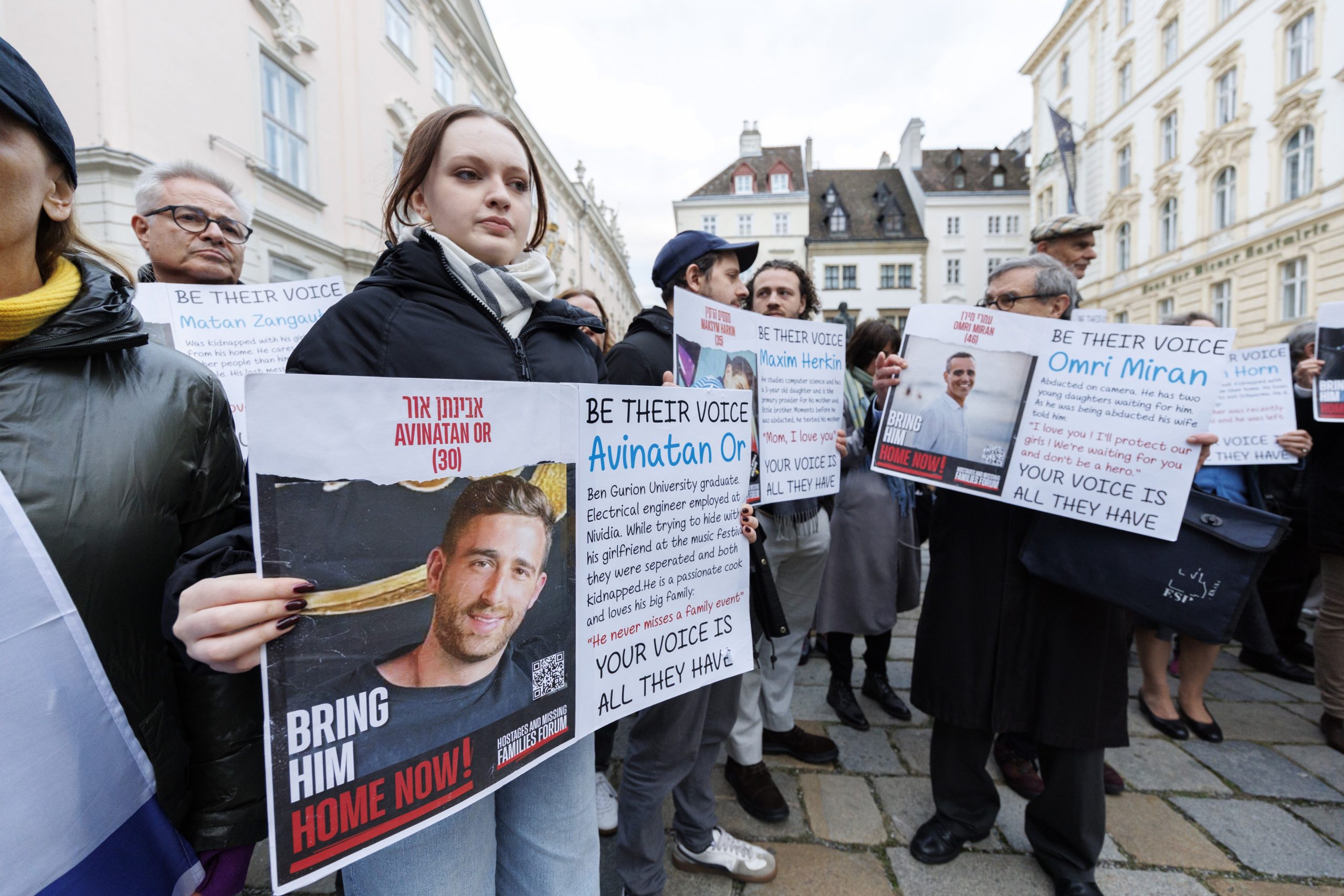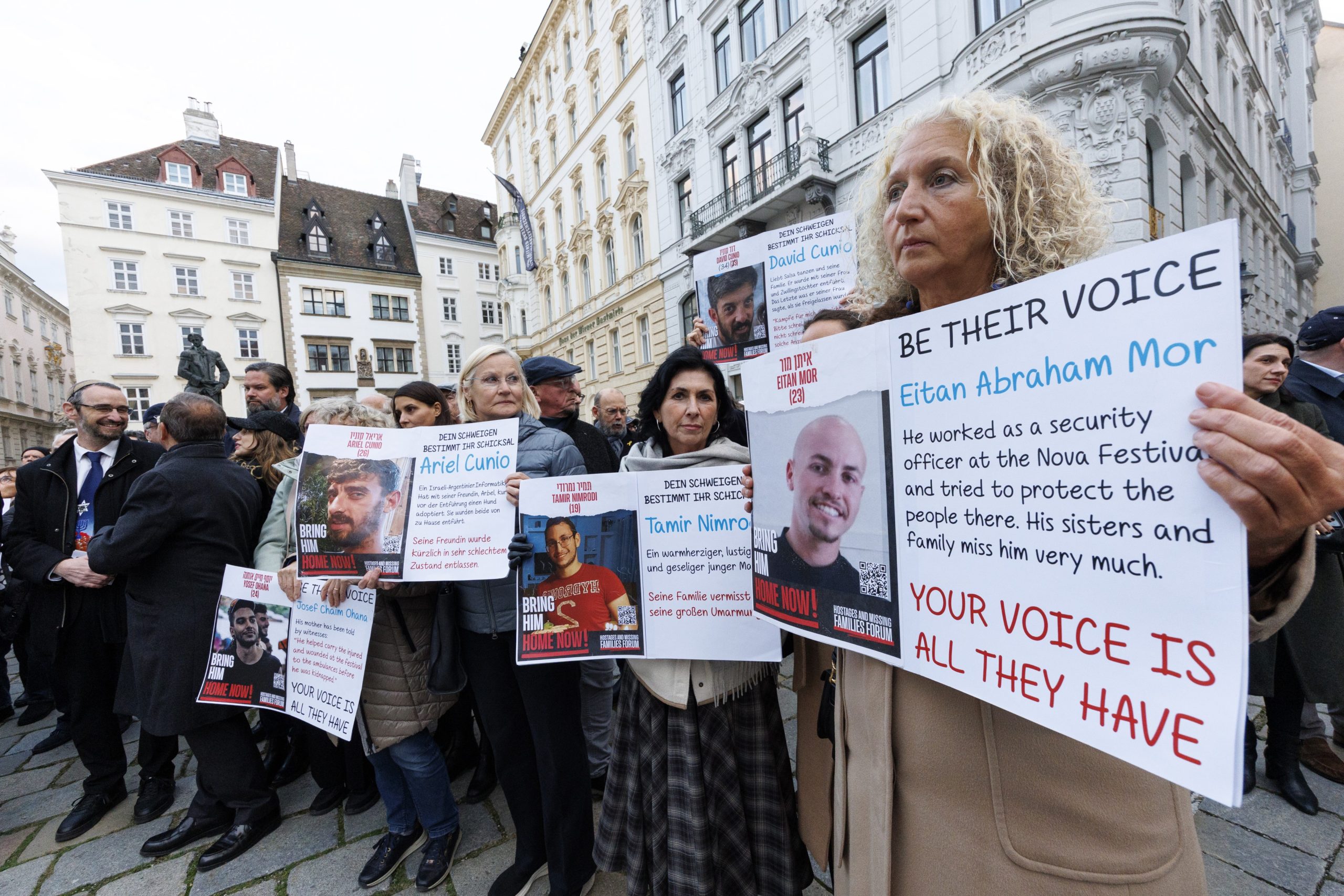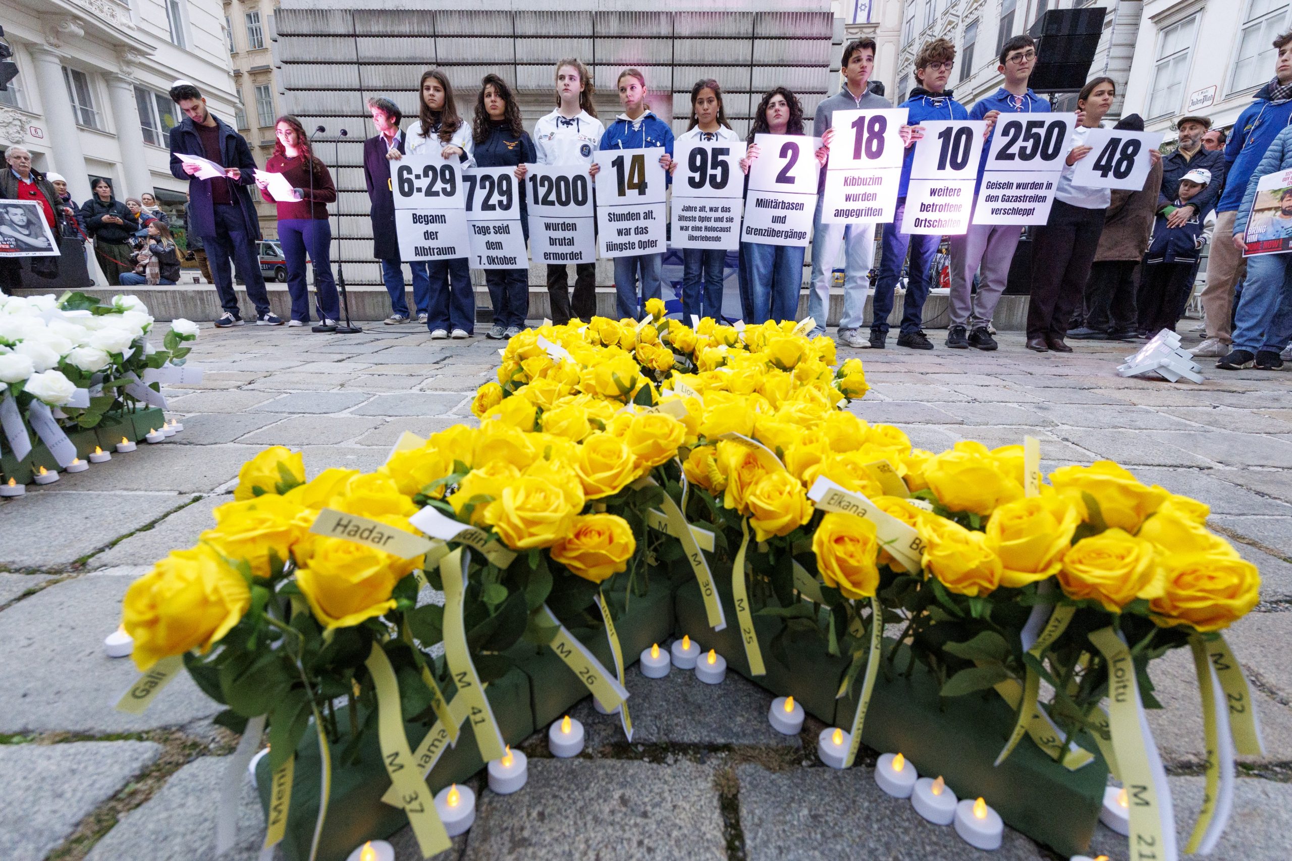Vor dem Mahnmal für die österreichischen jüdischen Holocaust-Opfer wurde auch an jene 48 Israelis erinnert, die sich bis heute in Geiselhaft im Gazastreifen befinden. "Bringt sie nach Hause", forderten die Kundgebungsgäste auf Schildern, die die Konterfeis der noch nicht befreiten Geiseln zeigten.