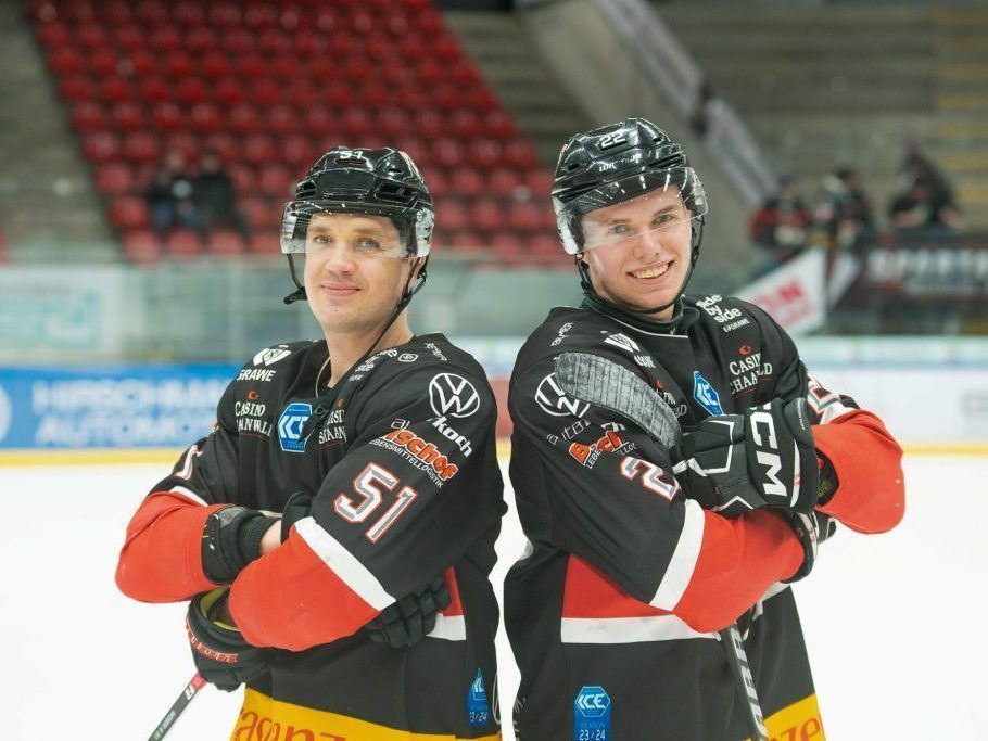 23.02.2024 Der älteste und jüngste Pioneers-Spieler freuen sich auf das Pre-Play-off.