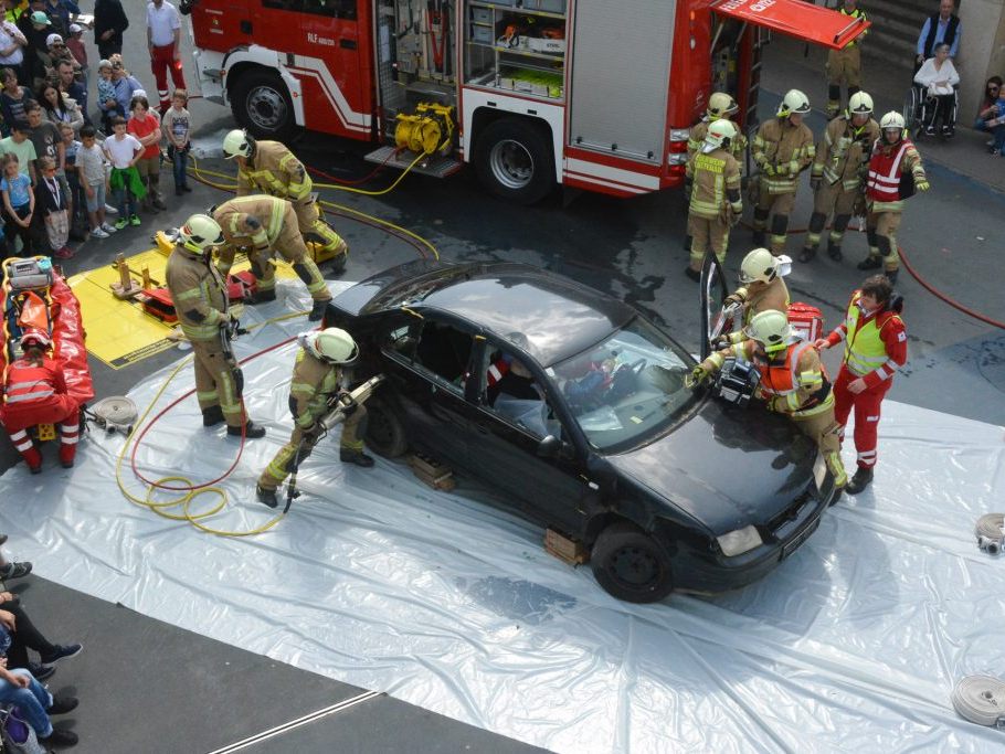 Wie die Feuerwehr ein Auto auf dem Lustenauer Kirchplatz aufschnitt
