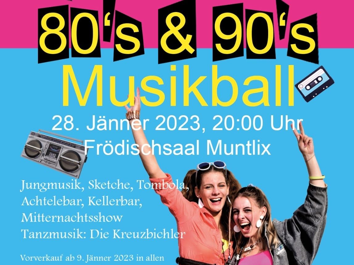 17.01.2023 Eine Reise in die 80er und 90er Jahre verspricht der diesjährige Musikball unter dem Motto "Best of 80s & 90s" am Samstag, den 28. Jänner 2023 im Frödischsaal in Muntlix.