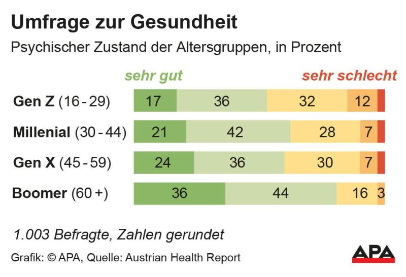 Befragt wurden insgesamt 1.003 Personen, davon 363 16- bis 19-Jährige, was in etwa der sogenannten Generation Z entspricht. 29 Prozent dieser jüngeren Altersgruppe beurteilen ihre psychische Gesundheit sehr gut oder gut, im Vergleich zu 63 Prozent der 30- bis 44-Jährigen, 60 Prozent der 45- bis 59-Jährigen und 80 Prozent der Menschen ab 60 Jahren. Damit reiht sich die psychische Gesundheit der Generation Z sichtbar unter den Durchschnitt der Bevölkerung ein, berichtete Raml. 15 Prozent der Jüngeren bezeichnen ihren psychischen Gesundheitszustand sogar als sehr schlecht oder schlecht.