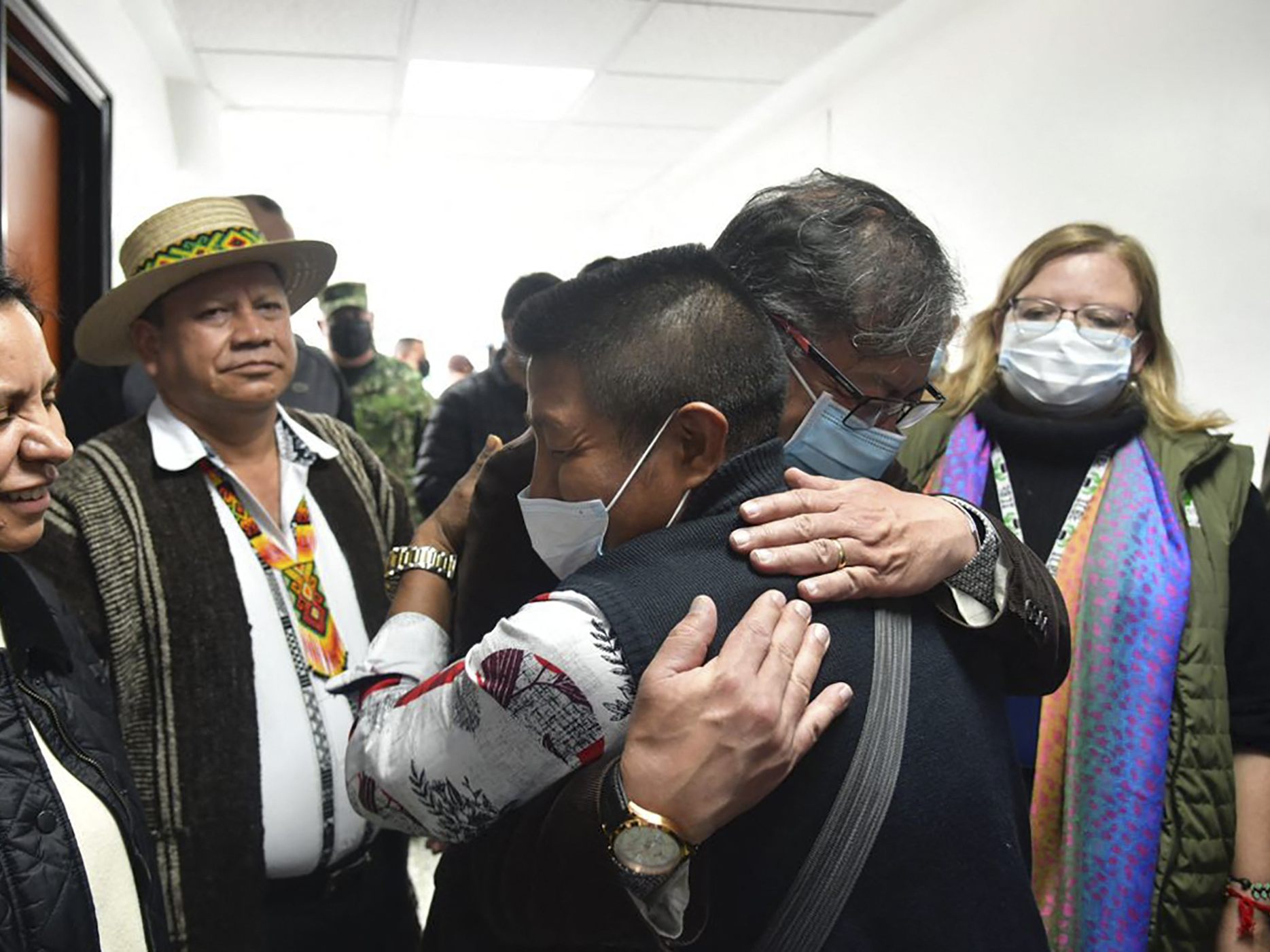 ©This handout picture released by the Colombian Presidency shows Colombian President Gustavo Petro (back) embracing Fidencio Valencia, the grandfather of the four Indigenous children who were found alive after being lost for 40 days in the Colombian Amazon rainforest following a plane crash, at the Military Hospital in Bogota on June 10, 2023. Four Indigenous children who had been missing for more than a month in the Colombian Amazon rainforest were found alive and flown to the capital Bogota early Saturday. The children, who survived a small plane crash in the jungle, were transported by army medical plane to a military airport at around 00:30 am Saturday (0530 GMT). (Photo by Prensa Presidencial / Colombian Presidency / AFP) / RESTRICTED TO EDITORIAL USE - MANDATORY CREDIT "AFP PHOTO / COLOMBIAN PRESIDENCY" - NO MARKETING NO ADVERTISING CAMPAIGNS - DISTRIBUTED AS A SERVICE TO CLIENTS Die Kinder wurden mit ihrer Familie vereint. ©AP; Reuters