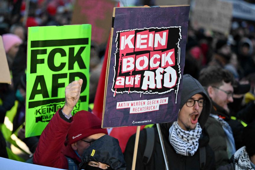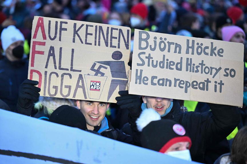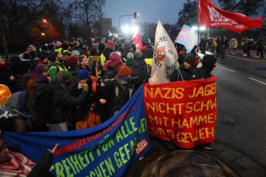 Protestierende skandierten "Alle zusammen. Gegen den Faschismus" und "Stoppt die Brandstifter" bei einer Kundgebung am Bahnhof. Auch an anderen Orten in der Stadt versammelten sie sich. Die voraussichtlich größte Demo startete nahe der Innenstadt. Der Deutsche Gewerkschaftsbund (DGB) hatte sie mit laut Polizei rund 30.000 erwarteten Teilnehmern angemeldet. Demonstranten kamen mit Schildern wie "Wir sind mehr", "Wir sind euer böses Gewissen" oder "Gießen für eine bunte Zukunft". Die Kundgebung begann mit Redebeiträgen und einem Aufruf, alles möge friedlich bleiben. Das Bündnis "Widersetzen" hatte schon vor Wochen angekündigt, es werde Zufahrtswege zu der Gründungsversammlung blockieren, um das Treffen zu verhindern.