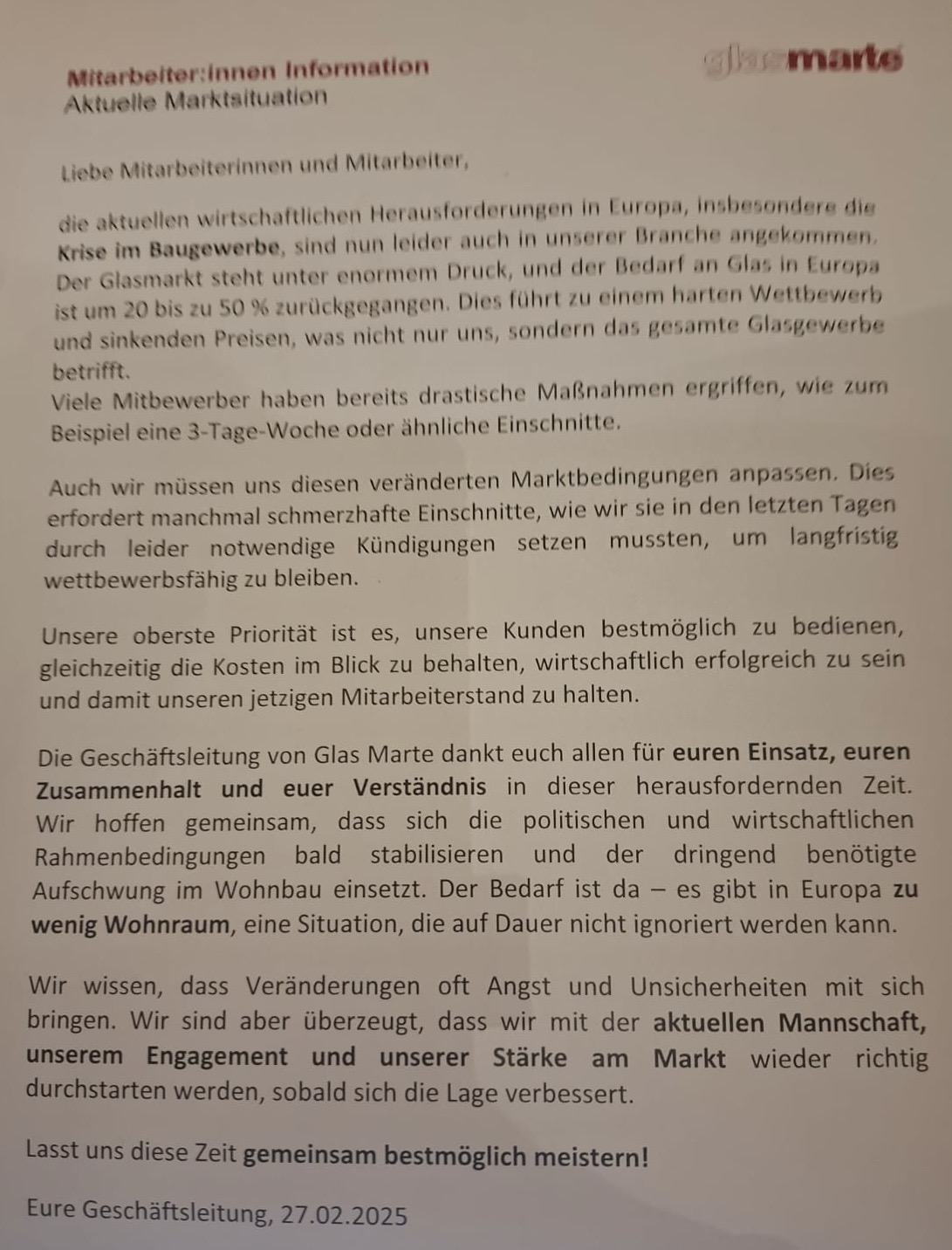 Während laut der Geschäftsführung von Glas Marte andere Betriebe bereits auf eine Drei-Tage-Woche umgestellt haben, musste Glas Marte nach eigener Aussage „schmerzhafte Einschnitte“ vornehmen.