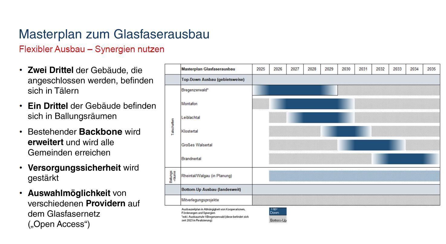 • Zeitplan: In den nächsten zehn Jahren sollen 60.000 Haushalte angeschlossen werden. In Koblach können erste Anschlüsse ab der zweiten Jahreshälfte 2025 aktiviert werden. In den Talschaften sollen bis 2026 erhebliche Fortschritte erzielt werden.
