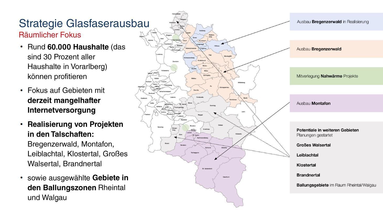 • Ausbaugebiete sind laut der "illwerke vkw" im Bregenzerwald die acht Gemeinden Sulzberg, Doren, Hittisau, Lingenau, Langenegg, Reuthe, Schwarzenberg und Bezau sowie Gaschurn, Thüringerberg und Raggal. Die Vorbereitungen für weitere Gemeinden laufen, hier wird der Baustart im Herbst erwartet.