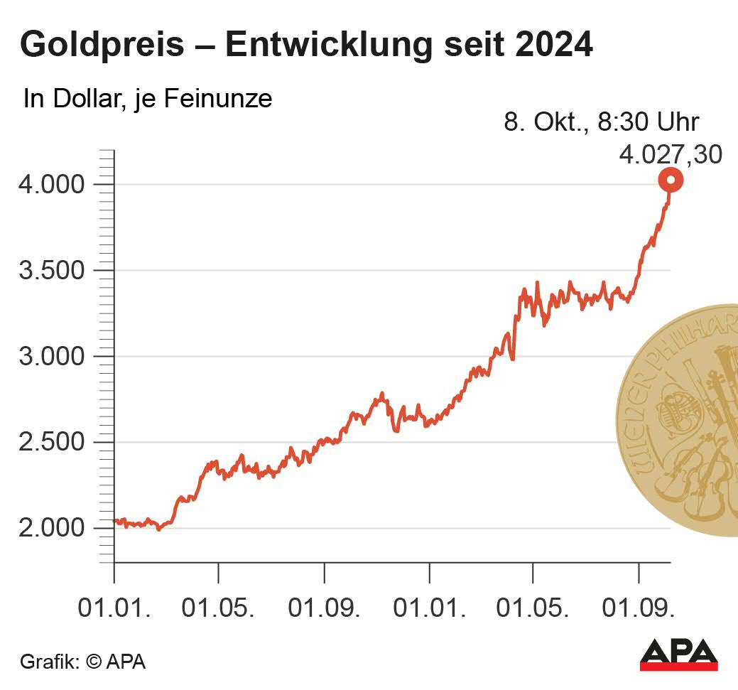 Gold hat im Zuge seiner seit Wochen und Monaten anhaltenden Rekordrallye eine weitere markante Marke geknackt. In der Nacht auf Mittwoch kostete eine Unze (etwa 31,1 Gramm) des Edelmetalls erstmals mehr als 4000 US-Dollar. Im weiteren Handelsverlauf kletterte der Goldpreis peu à peu weiter. Am frühen Abend zog der Preis in der Spitze um bis zu 1,9 Prozent auf 4059 Dollar an.