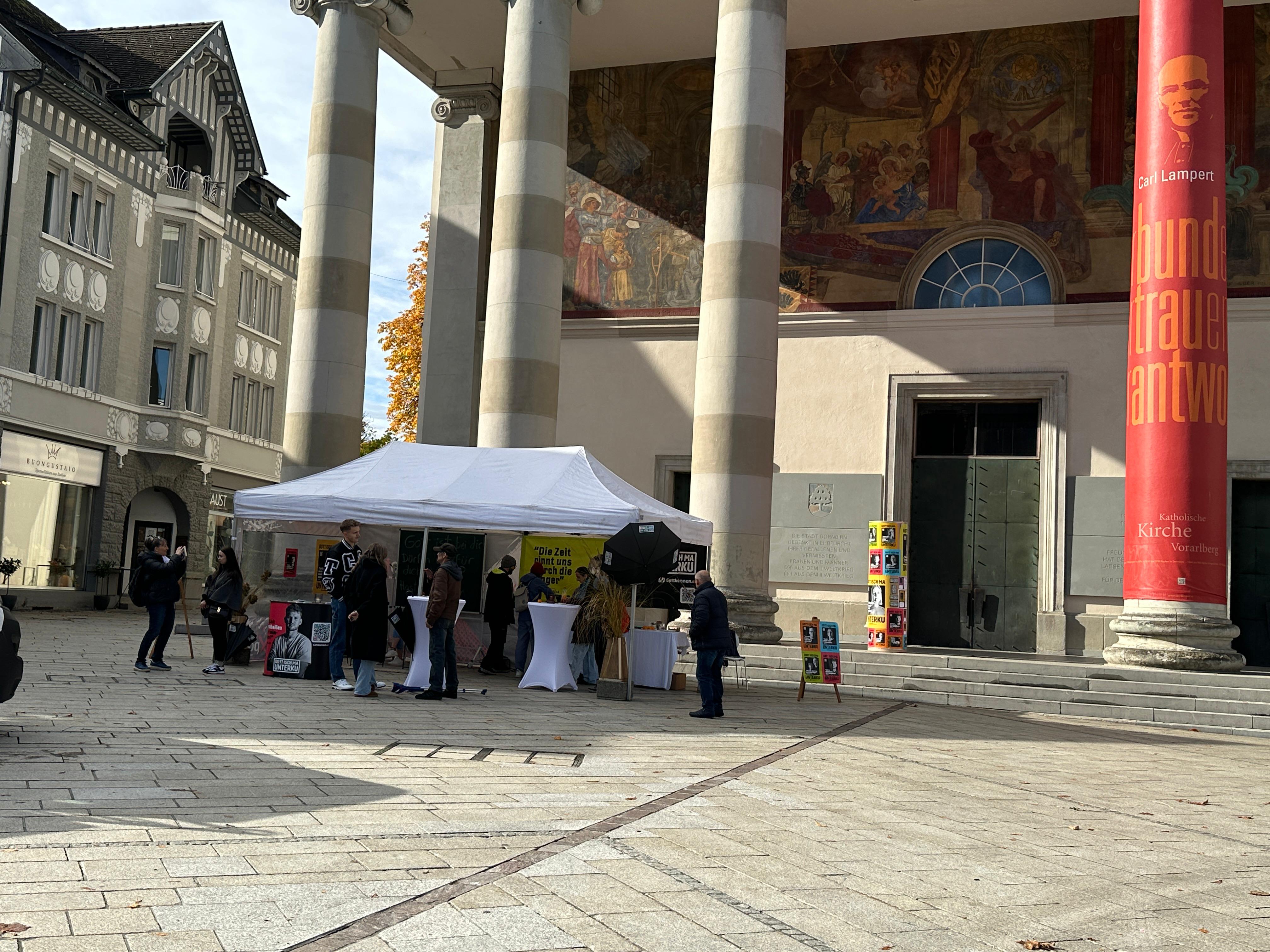 Am Dornbirner Marktplatz trifft die VOL.AT-Redaktion Linus und Sophie Metzler aus Hard, beide jung und motiviert. Sie stehen am Infostand, sprechen Passanten an und verteilen Flyer. "Wir haben ganz verschiedene Leute getroffen, von sehr offen bis sehr ablehnend", erzählt Linus. "Aber selbst mit denen, die ablehnen, führen wir gute Gespräche."