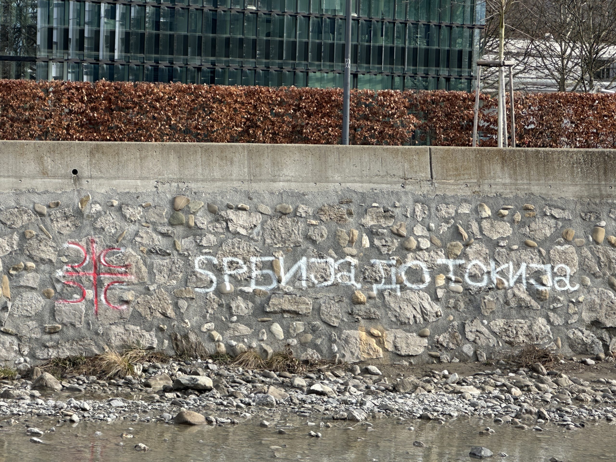 An der Dornbirner Ach auf Höhe des Bushaltestelle Egetenweg (Nahe Zumtobel Group) tauchte in den vergangenen Tagen ein neuer Schriftzug auf. Besonders die Aufschrift "СРБИЈА ДО ТОКИЈА" (Serbien bis Tokio) fällt ins Auge. Der Spruch wird in der serbischen Fußball-Fanszene häufig verwendet.