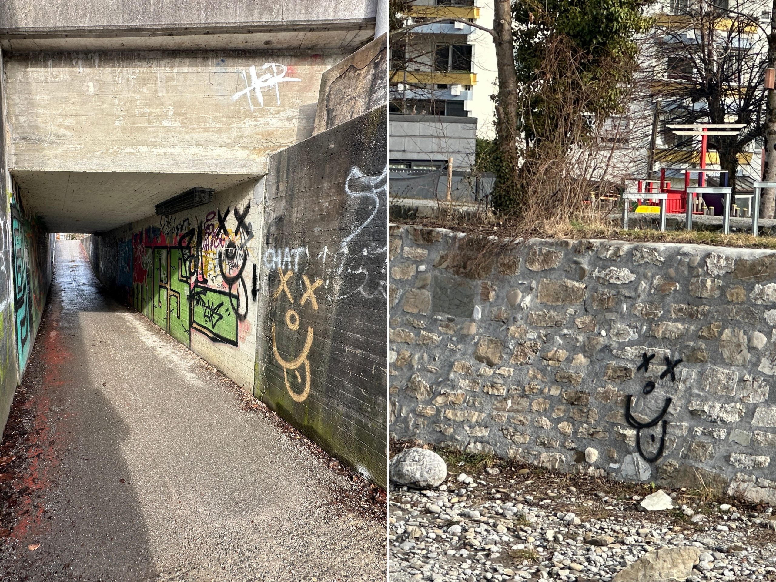 Wie ein VOL.AT-Lokalaugenschein zeigt, finden sich fast idente Smileys an der Dornbirner Ache auf der Mauer und in einer Unterführung: