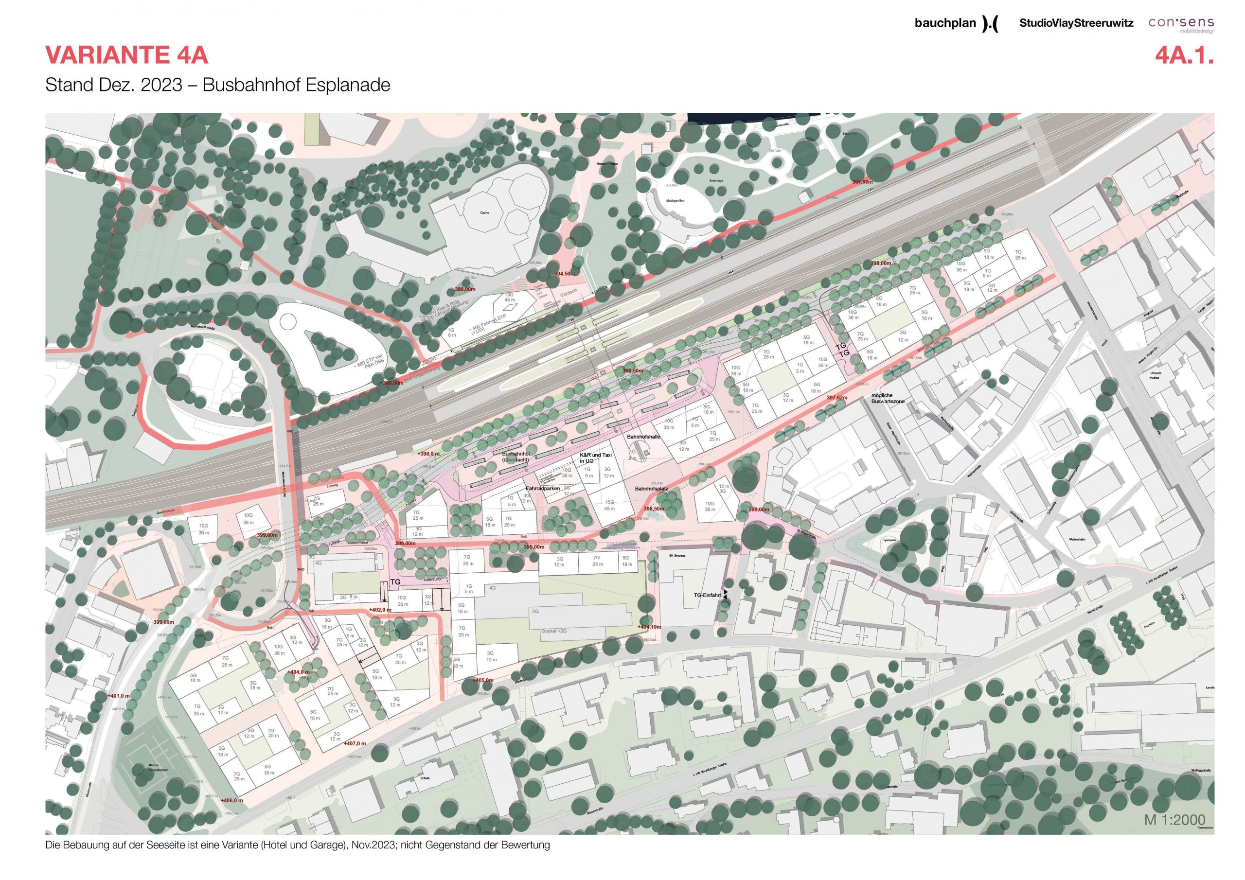 Konkret unterschrieben wurden von Landeshauptmann Markus Wallner (ÖVP), Mobilitätslandesrat Daniel Zadra (Grüne), Bürgermeister Michael Ritsch (SPÖ) und ÖBB-Infrastruktur AG-Vorständin Judith Engel unter anderem eine Absichtserklärung zum auf dem Tisch liegenden Projekt sowie Planungsvereinbarungen zu Verlegung und Umbau der Landesstraßen L202 und L190. Umgesetzt werden soll nach einem städtebaulichen Wettbewerb die Variante "4a", derzufolge der neue Bahnhof am jetzigen Standort verbleibt - auch ein Neubau am alten Bahnhofsstandort (bis 1989) war geprüft worden.