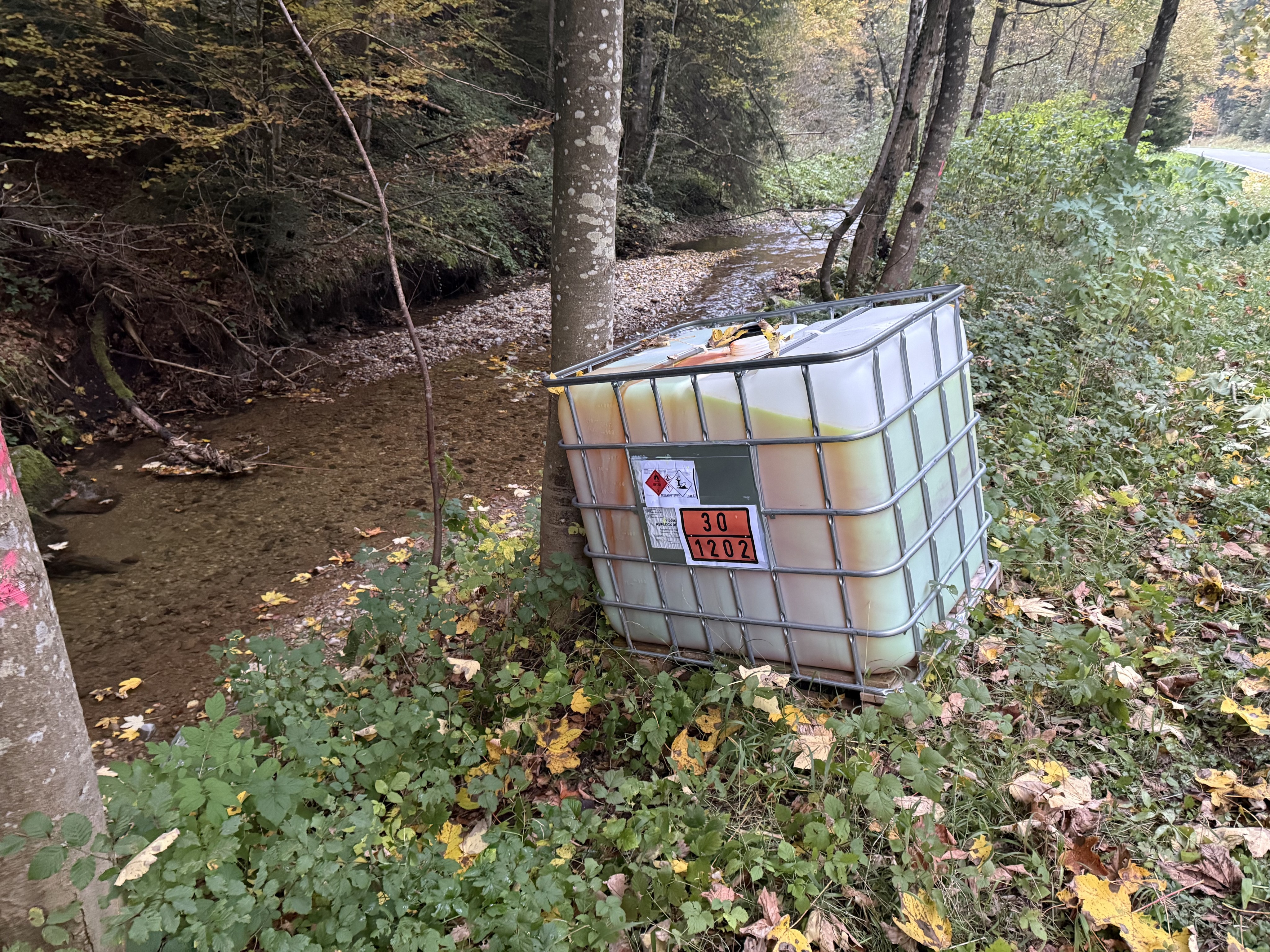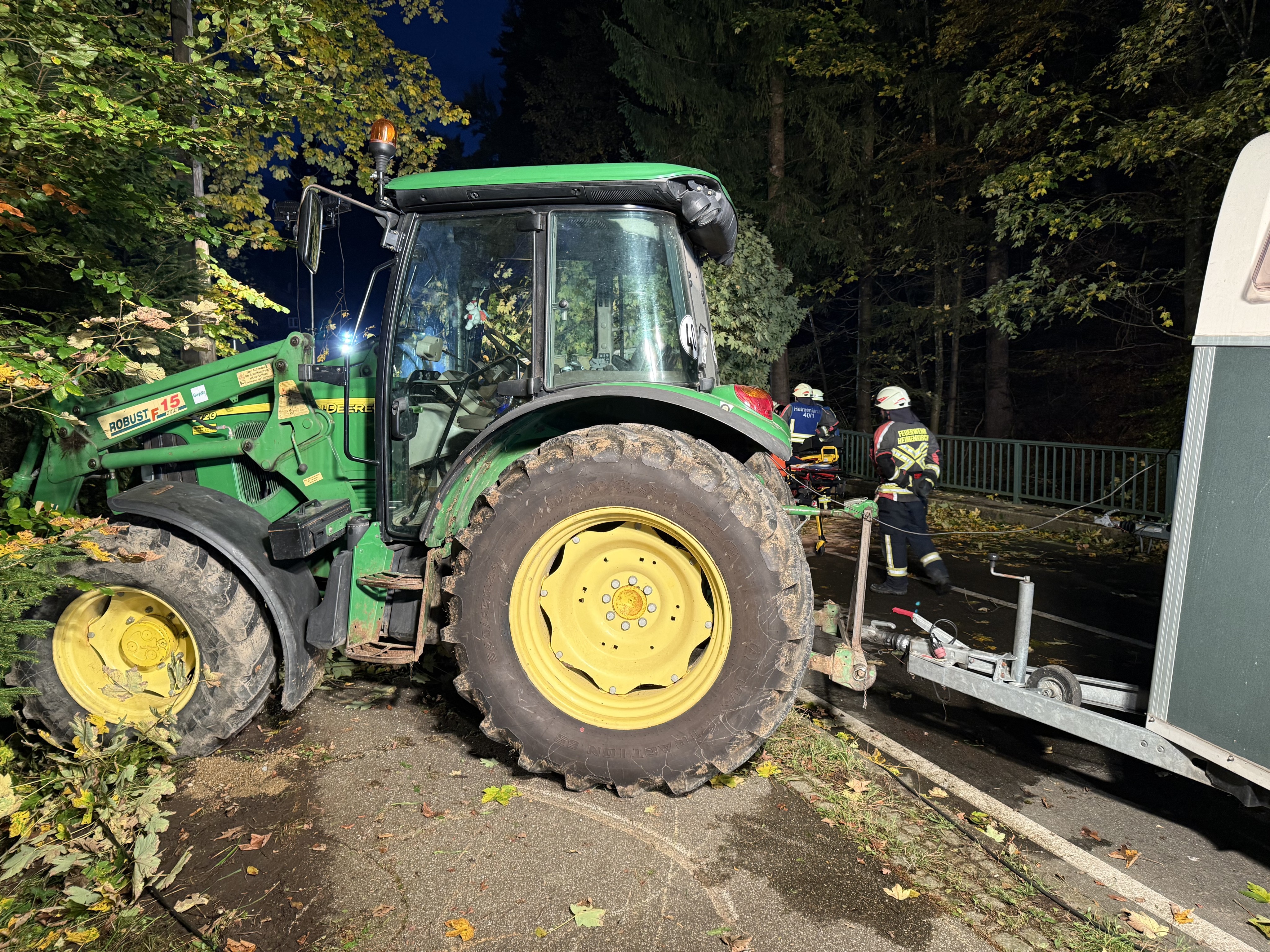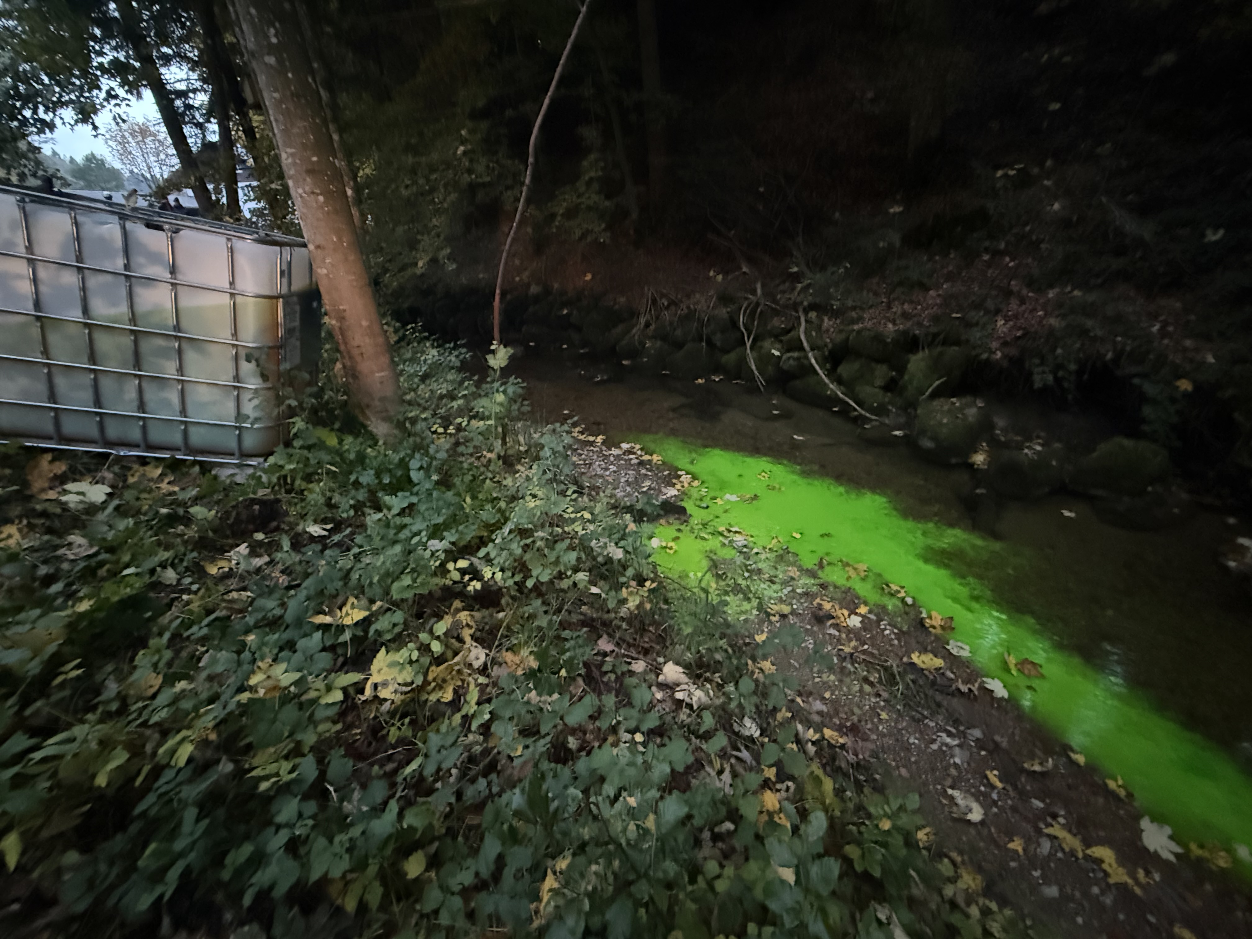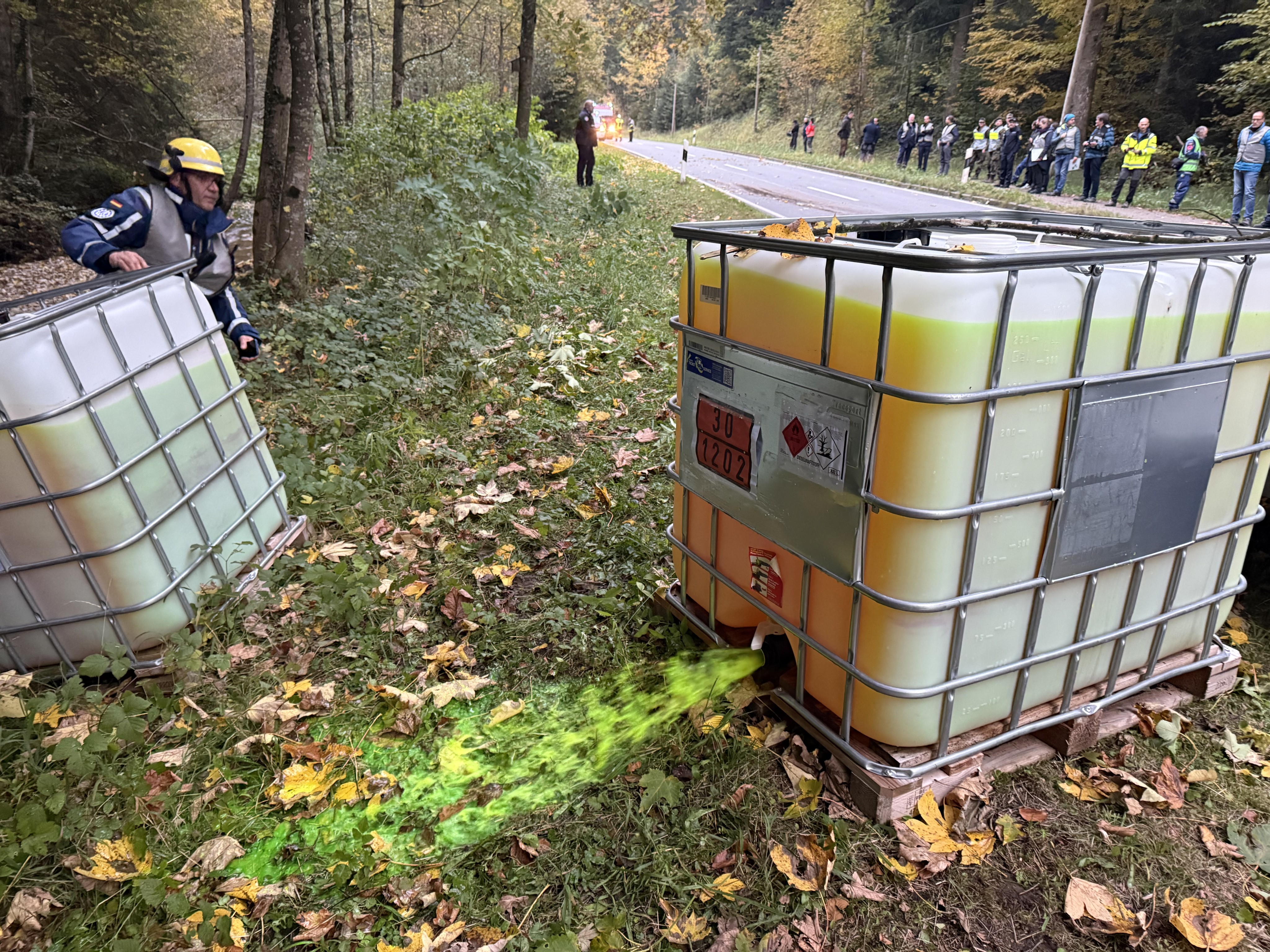 Zusätzlich war ein Anhänger mit Gefahrgut Teil des Übungsszenarios. Die simulierte Gefahrstoffmenge trat aus und verteilte sich in einen angrenzenden Bach.