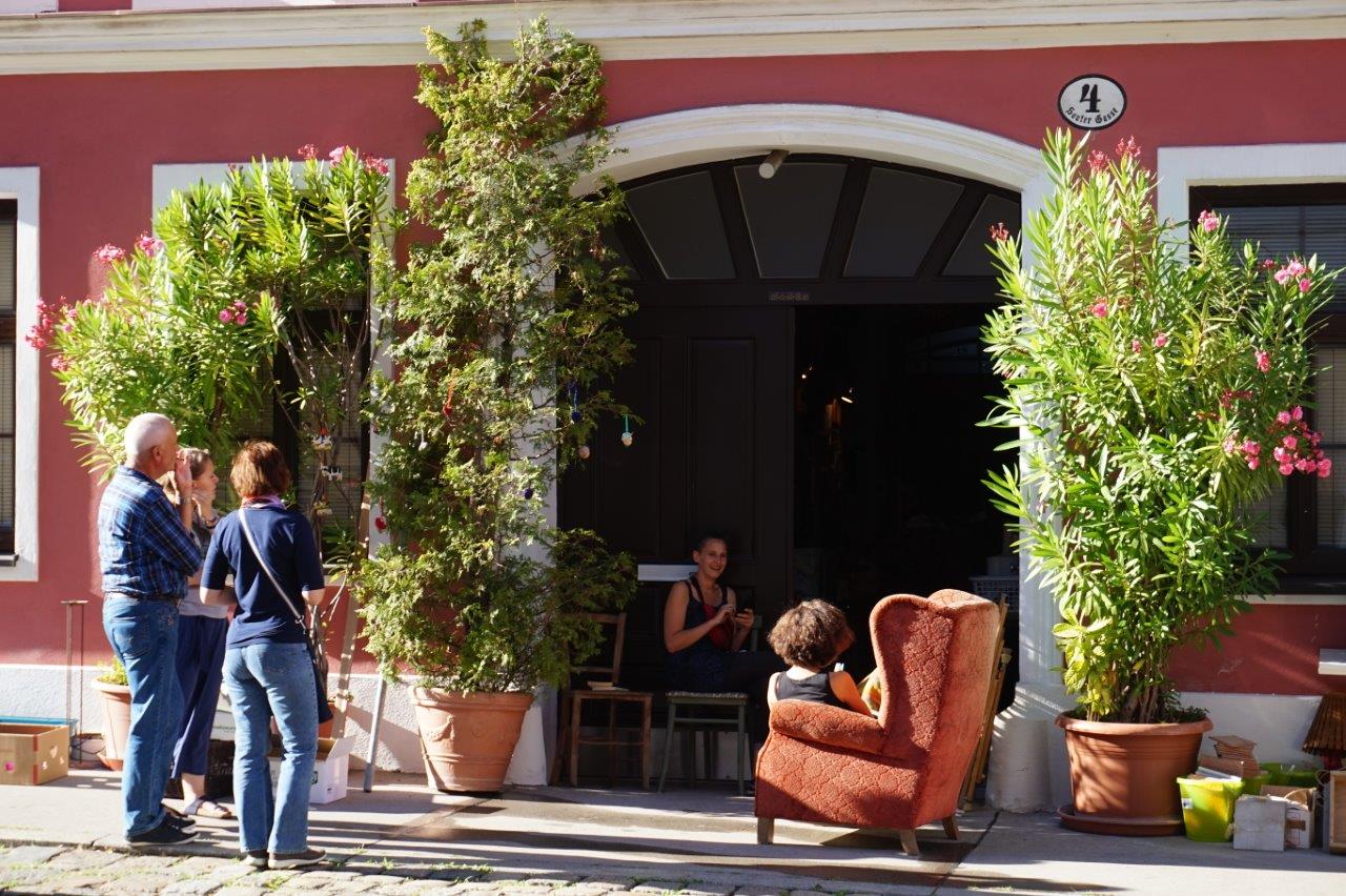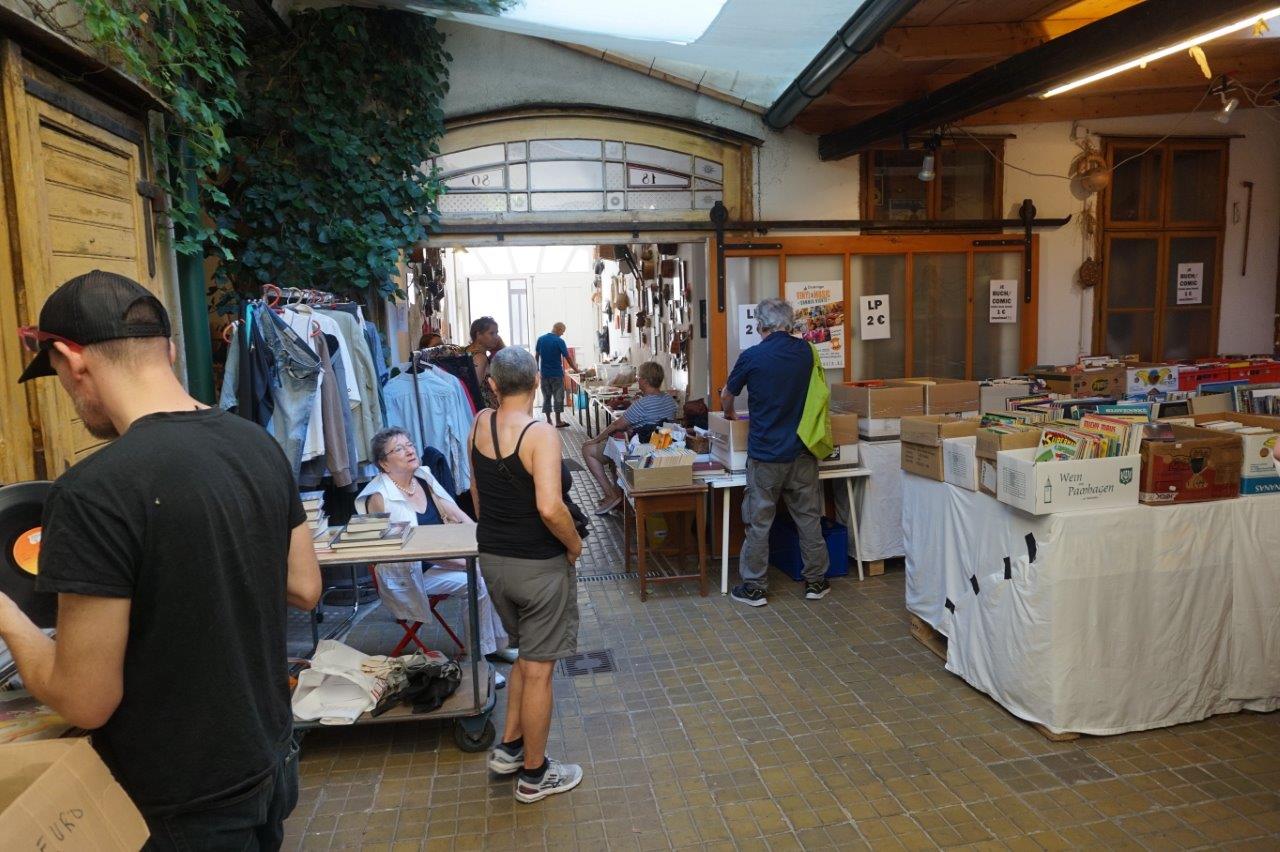 Die Bewohner*innen und Freund*innen des Hauses Sautergasse 4 in Wien-Hernals, veranstalten den beliebten Flohmarkt im Hof und der Einfahrt des alten Fuhrwerker-Hauses (ca. 1880 erbaut).