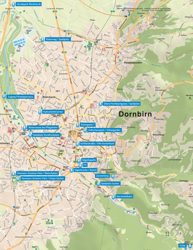 Dornbirn. 19 an das öffentliche Wassernetz angeschlossene Trinkbrunnen stehen im Stadtgebiet zur Verfügung. Sie befinden sich in den Stadtteilparks, bei Sportanlagen, bei größeren Spielplätzen oder entlang der heuer eröffneten Stadtspuren. Im heurigen Jahr wurden zusätzlich sieben neue Brunnen errichtet. Darüber hinaus gibt es in Dornbirn rund 120 öffentliche oder private Laufbrunnen, Großteils mit Trinkwasserqualität.