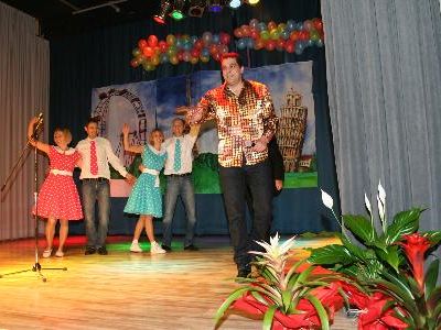 Die Reise um die Welt startete dann mit dem Land Österreich, ging weiter nach Italien, Amerika, Mexiko, Deutschland und China. Neben vielen kleinen und großen Akteuren, Bekannten und neuen Mitwirkenden, wurde schon ganz gespannt der Auftritt von Bürgermeisterkandidat Harald Köhlmeier erwartet. Souverän interpretierte er den Hit Sugar Baby” von Peter Kraus und mit Esprit und Charme mischte sich Harald Köhlmeier unter das begeisterte Publikum wobei es gleich ersichtlich wurde, dass er ein sehr bodenständiger Mann ist und sich den Menschen verbunden fühlt einfach ein Mann zum Angreifen”.