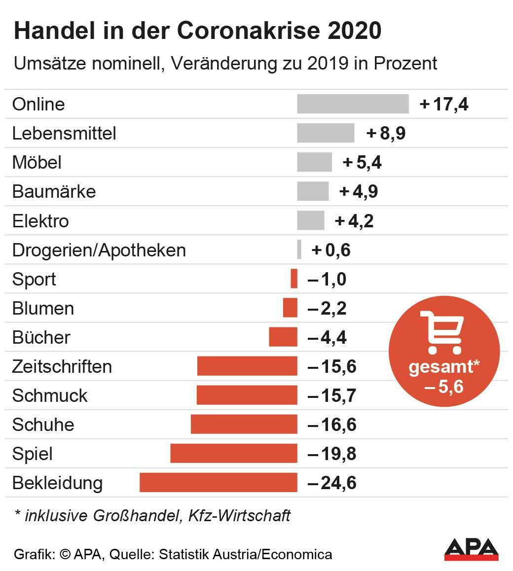 Im gesamten Einzelhandel gab es 2020 ein nominelles Erlösplus von 0,1 Prozent, von Jänner bis November wurde im Großhandel um 7,2 Prozent und in der Kfz-Wirtschaft um 11,6 Prozent weniger eingenommen. Die Zahlen basieren auf vorläufigen Daten der Statistik Austria und wurden vom Economica-Institut im Auftrag der Wirtschaftskammer WKÖ analysiert. "Die Krise hat mit wenigen Ausnahmen alle Handelssektoren schwer getroffen", sagte WKÖ-Handelsobman Rainer Trefelik am Freitag bei einer Online-Pressekonferenz. "Der Durchschnittswert bildet nicht die reale Situation ab." Man müsse tiefer in die Branchen hineinschauen, auch regional.