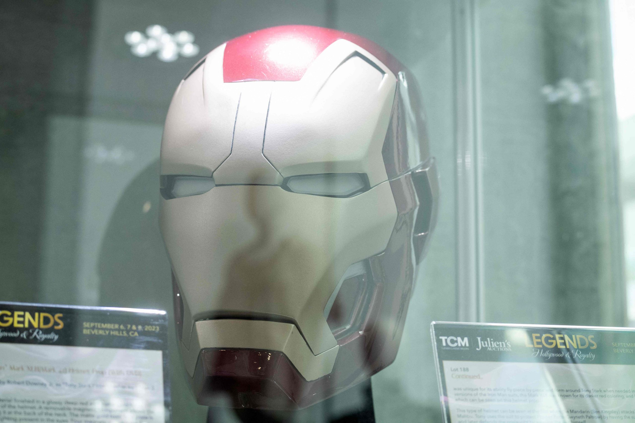 Der von Robert Downey Jr. in Iron Man 3 getragene Iron-Man-Mark-XIII-Helm wurde am 28. August 2023 bei einer Pressevorschau zur Auktion „Legends: Hollywood and Royalty“ in Beverly Hills ausgestellt