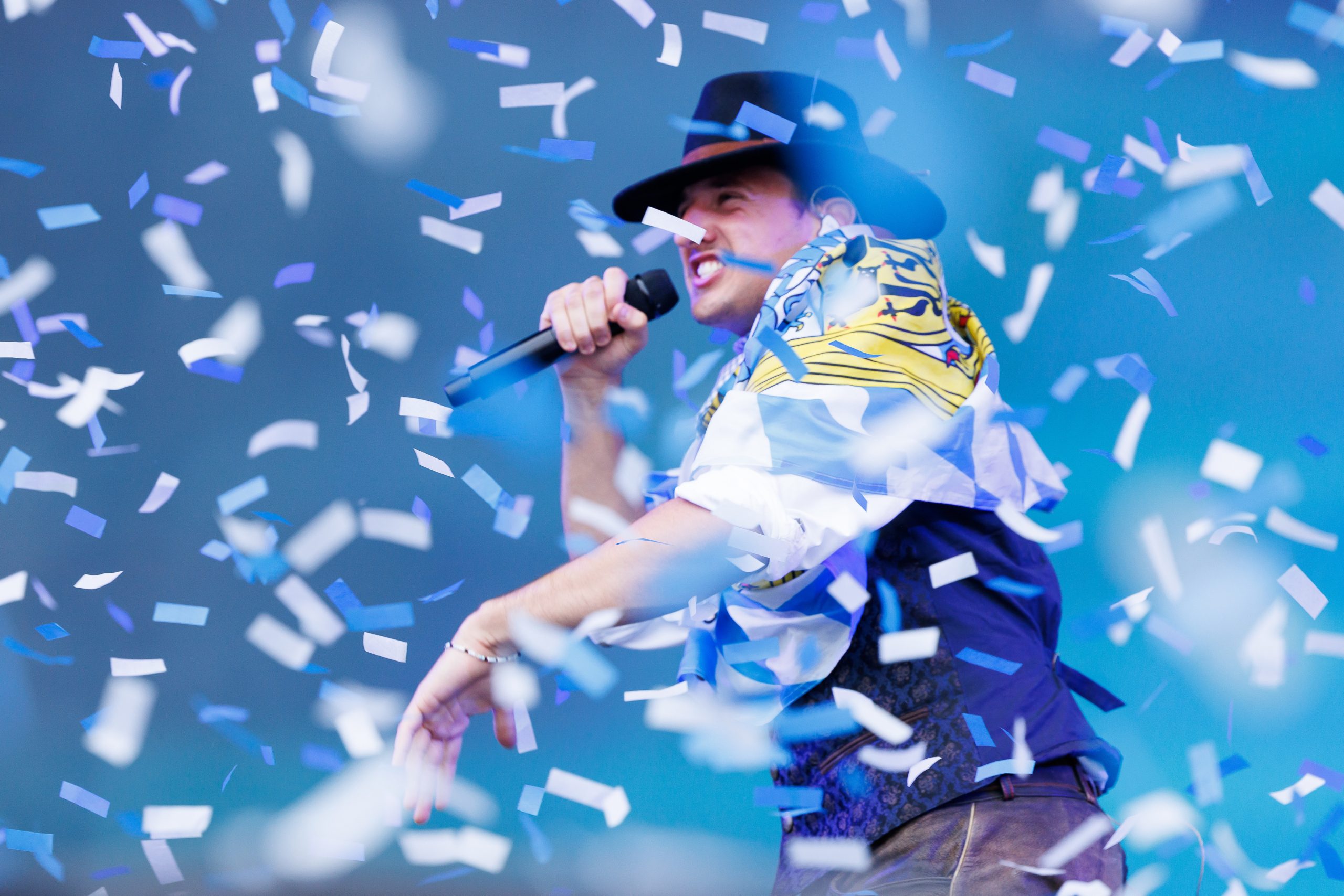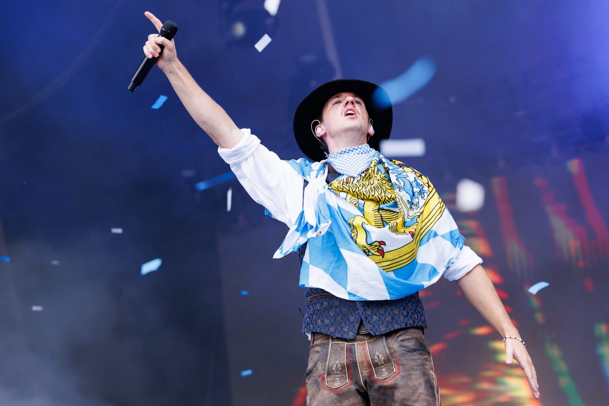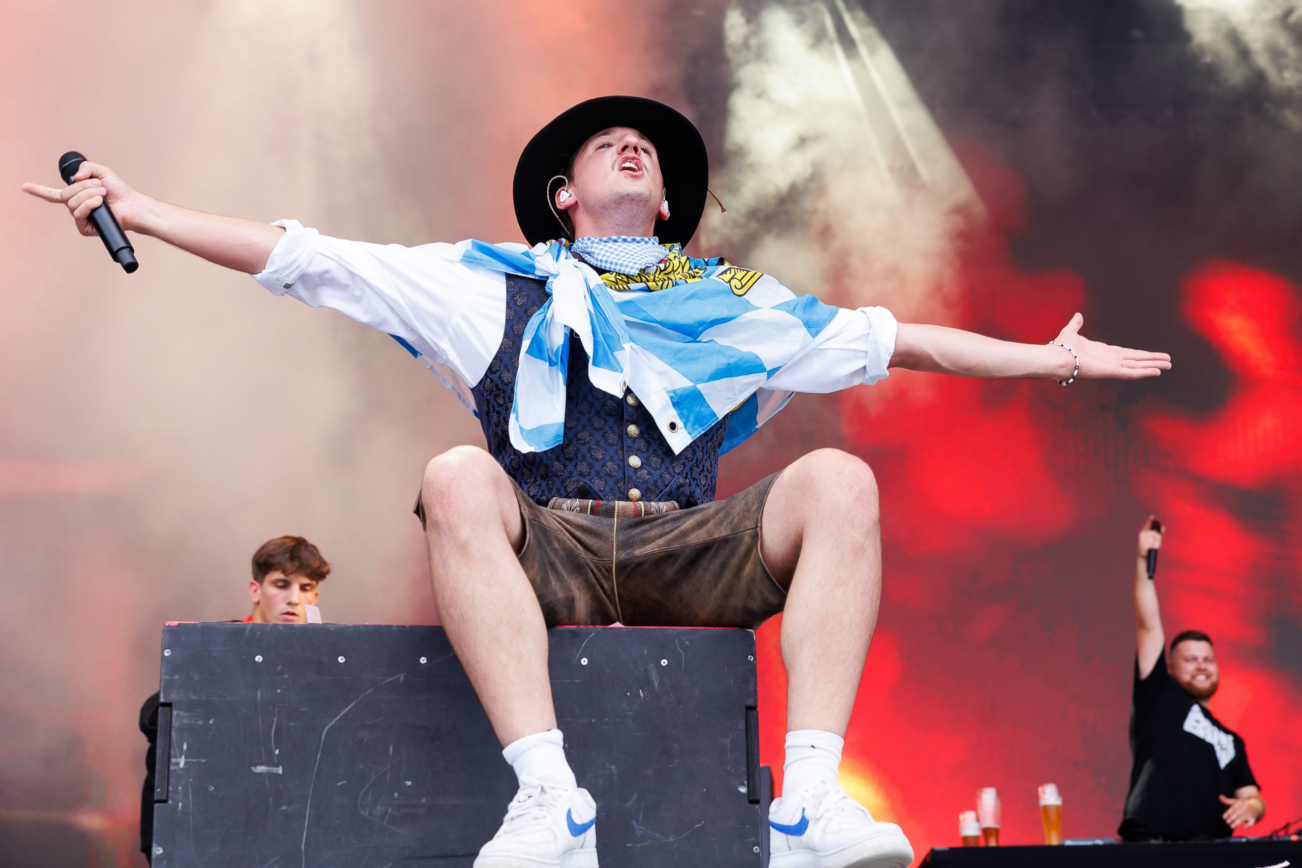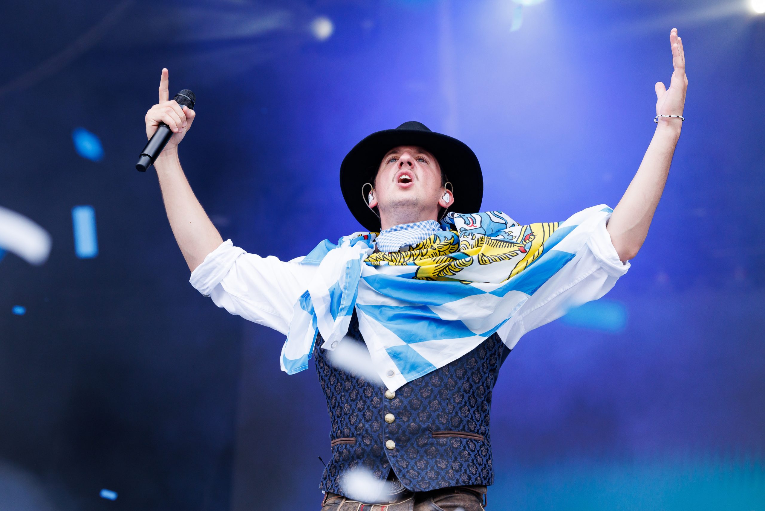 Mit seinem Rummel- und Ballermanntechno, aufgezuckert mit einer wie aus dem örtlichen Musikverein entlehnten Bläser- und Quetschn-Abordnung, verwandelte Tream aus Bayern das Partygelände im Anschluss in ein riesiges Open-Air-Bierzelt. Dorfjugend, Alkohol, Frauen und Autos ziehen sich da als blau-weißer Faden durch das Werk des laut Selbstdefinition ersten Partyschlagerrappers Deutschlands, der mit um den Hals geschlungenem Bayern-Halstuch, kurzer Ledernen und Nike-Sneakers der grölenden Menge ordentlich einheizte - nicht zuletzt dank Feuerfontänen auf der Bühne. Oktoberfest lässt grüßen. Und weil man sich der Gunst der Masse ganz sicher sein wollte, wurde dann auch noch "I am from Austria" intoniert.