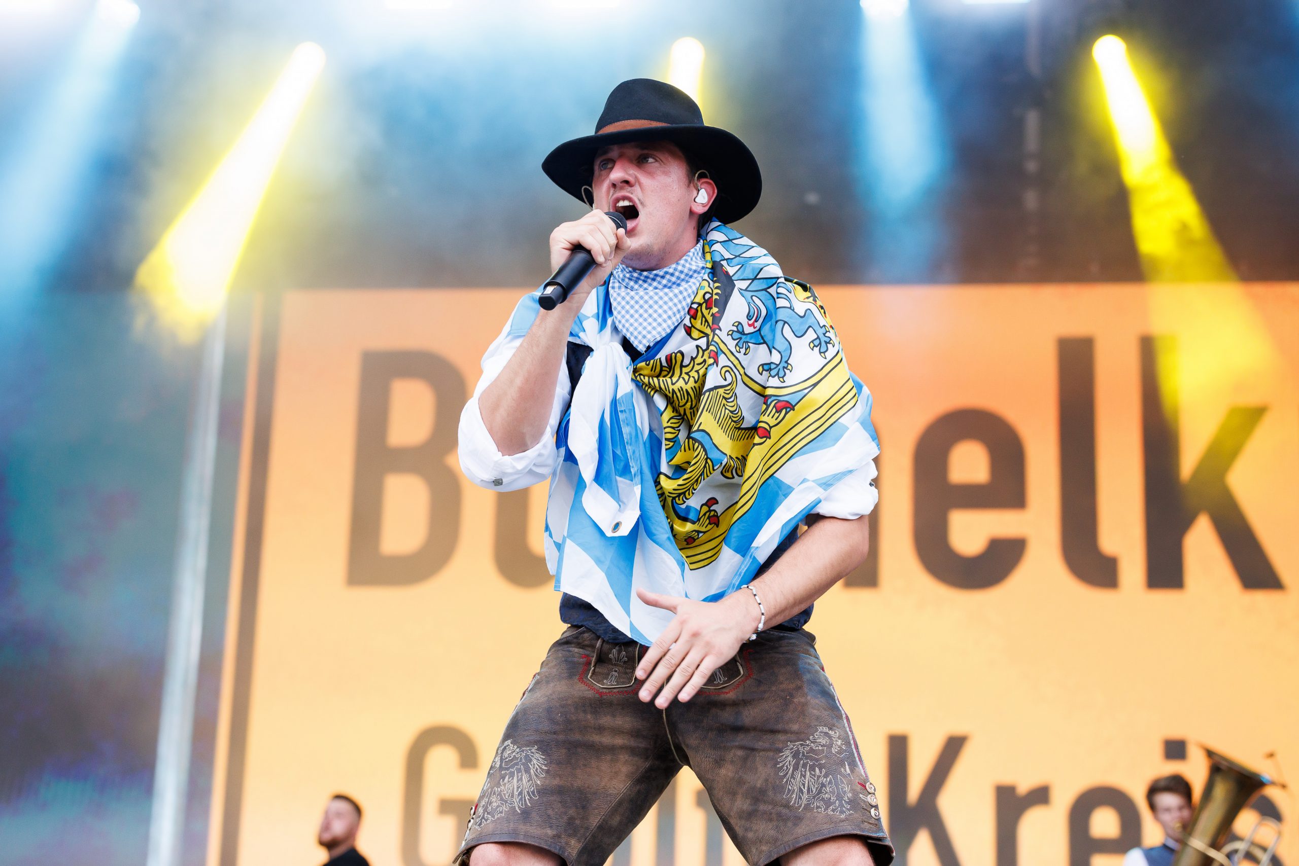 Wenig später setzte der Tream-Frontman zu einer Überraschung an – ist das Ed Sheeran? Der vermeintliche Superstar stürme auf die Bühne und begleitete den Bayern zum Song "Vo Mello bis ge Schoppornou" der Bregenzerwälder Band "Holstuonarmusigbigbandclub".
