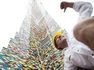 Die einzelnen 25 Zentimeter hohen Teile wurden aneinandergefügt und mit einem Kran auf den Legoturm gesetzt. Auf diese Weise wurden insgesamt rund 550.000 Legosteine verbaut. Der Turm wiegt rund 1,5 Tonnen und muss mit Drahtseilen stabilisiert werden. Doch der Anblick wird den Besuchern wohl nicht erhalten bleiben: Schon am Wochenende soll er wieder in seine Einzelteile zerlegt werden.