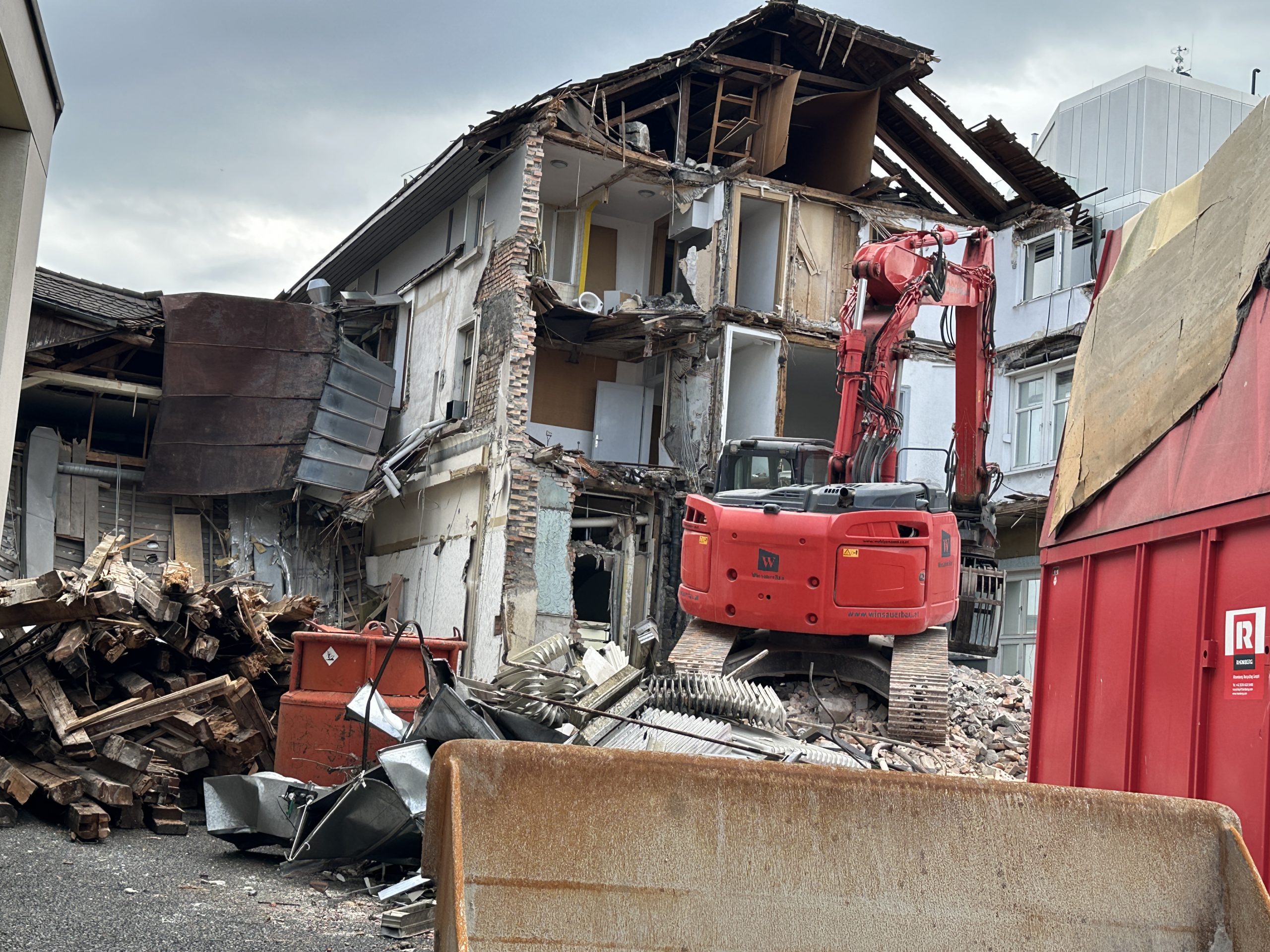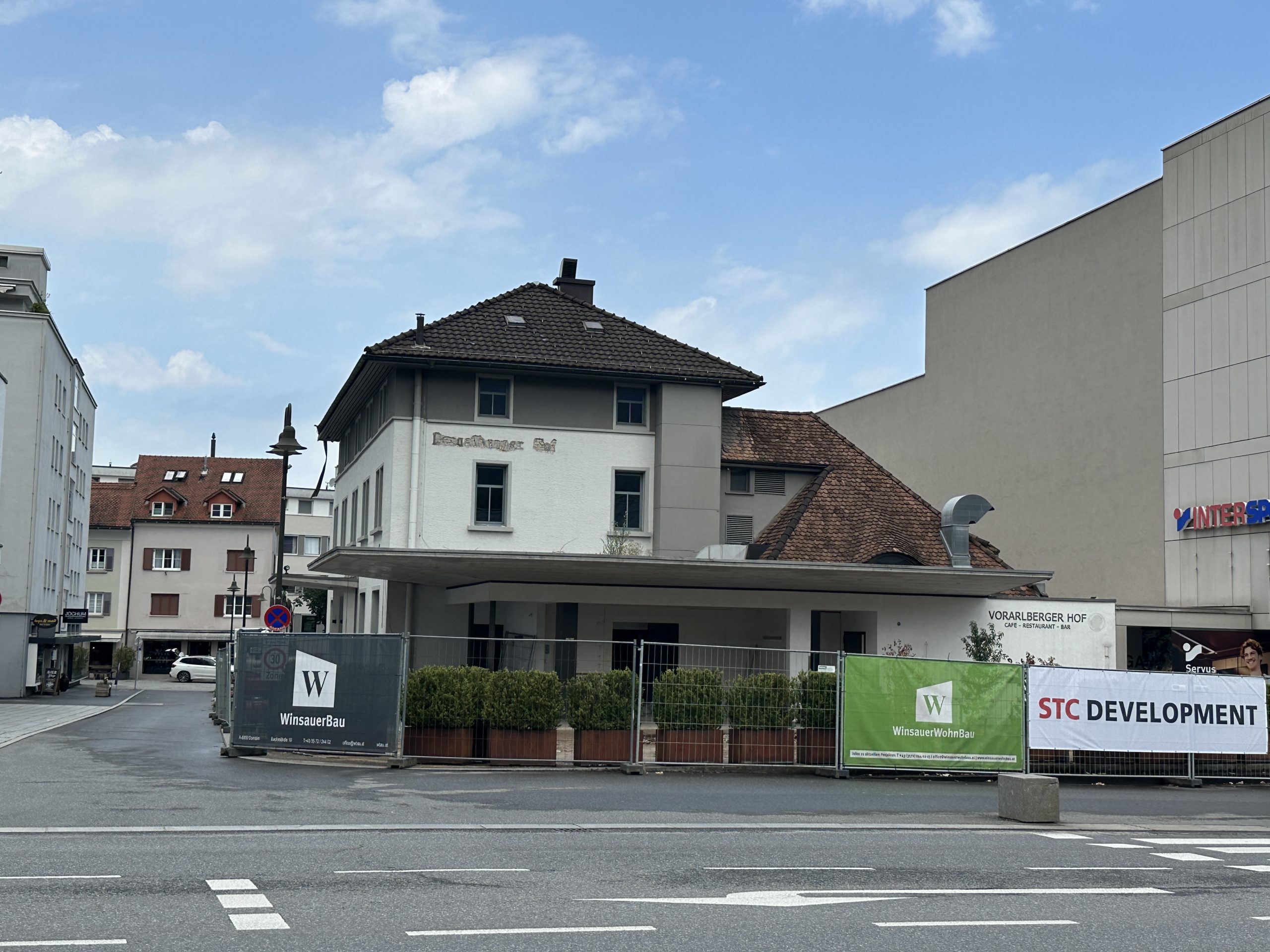 Die Dornbirner SPÖ steht zumindest vorübergehend ohne Heimstätte da. Der Vorarlberger Hof in der Viehmarktstraße wird aktuell abgerissen. Während das Gebäude von vorne noch recht intakt wirkt, kann man von hinten bereits in das Innere blicken.