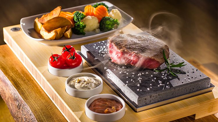 Täglich ab 18 Uhr wird bei Bestellung eines Filet Lady’s Cut oder Rib Eye Steak direkt am Tisch gegrillt. Der heiße Stein wird im Backofen bei einer Temperatur von 350 Grad Celsius vorgeheizt. Die Hitze wird im Stein gespeichert, die kontinuierliche und gleichmäßige Abgabe der Wärme garantiert einen fettarmen Bratvorgang und ein perfektes Grillerlebnis.