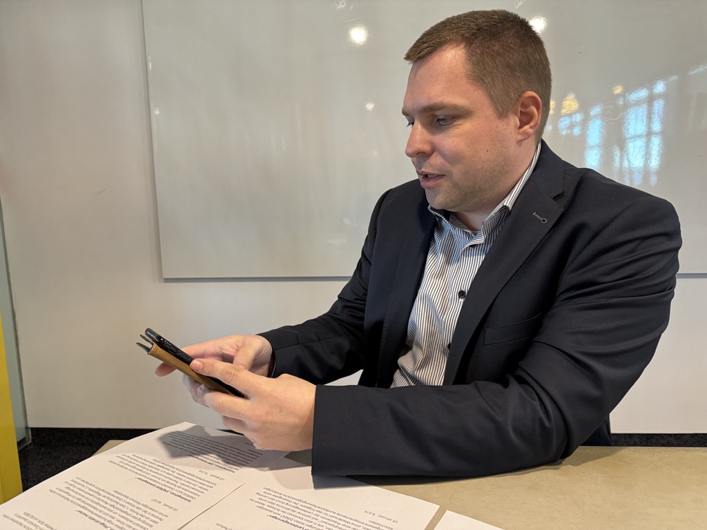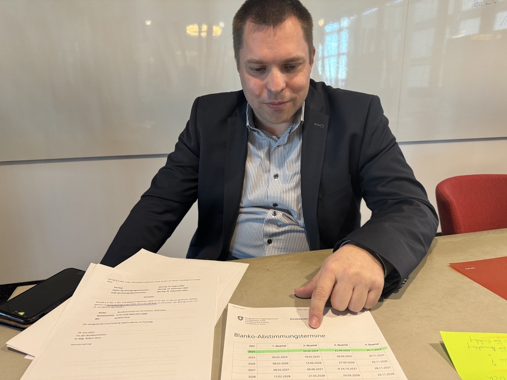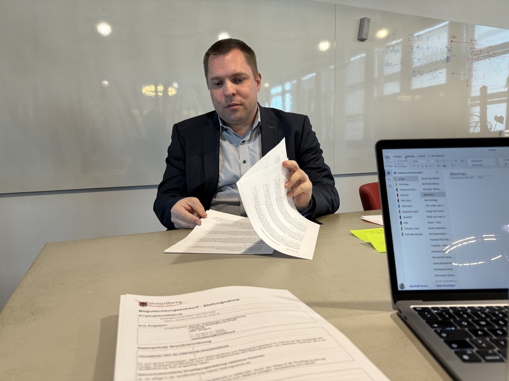 Bitschnau zeigt im VOL.AT-Gespräch, wie er den Überblick über seine Volksbegehren wahrt. ©Schad