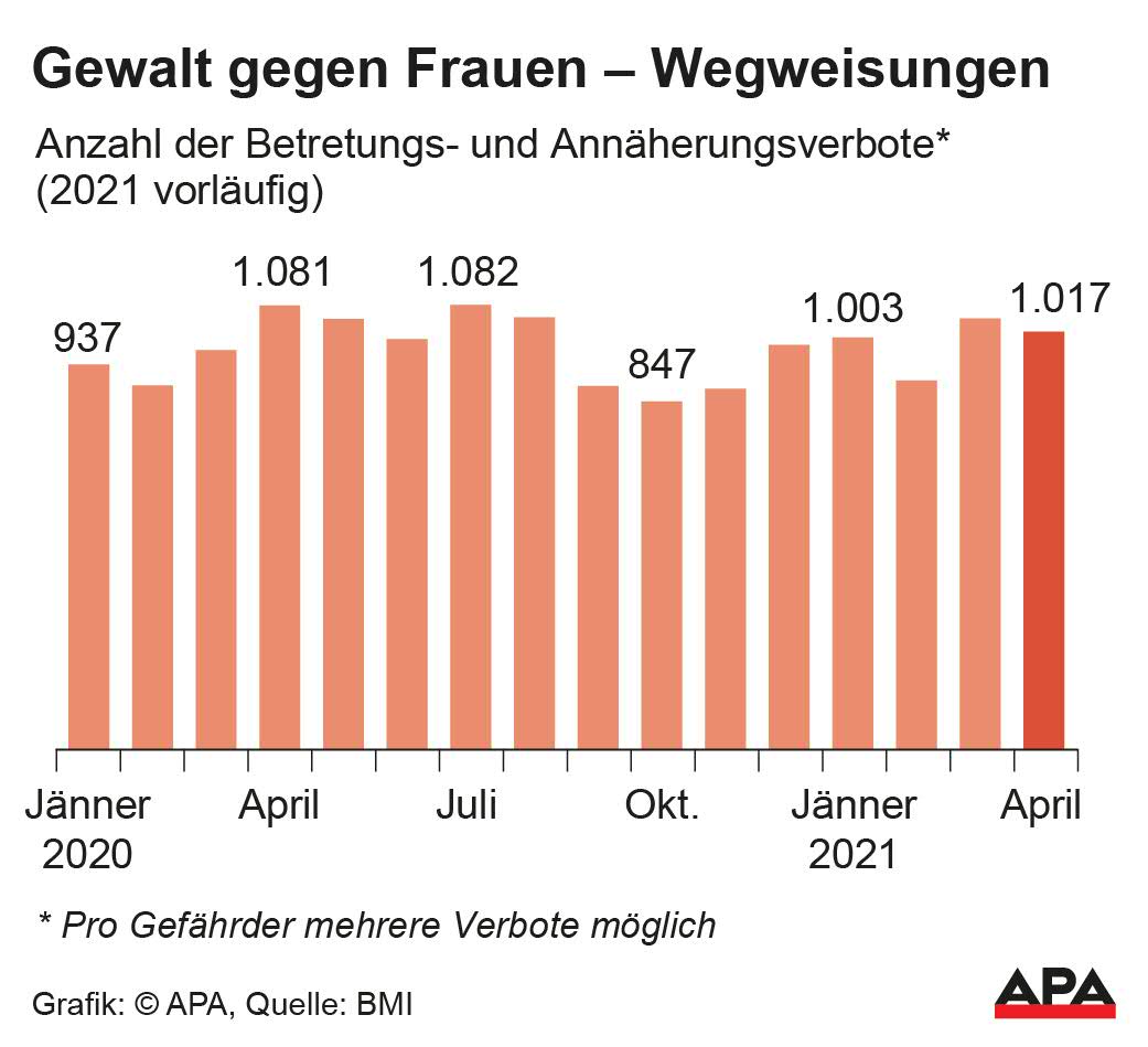 Wie viele Gefährder im laufenden Jahr bereits weggewiesen wurden, blieb zunächst offen. Heuer wurden im Jänner 1.003 Betretungs- und Annäherungsverbote ausgesprochen (2020: 937), im Februar 898 (2020: 886), im März 1.049 (2020: 972) und im April 1.017 (2020: 1.081). Das Innenministerium wies darauf hin, dass es sich bei den Zahlen für 2021 um Rohdaten handelt, die noch nicht geprüft wurden.