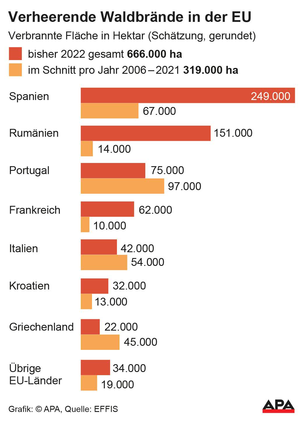 "2022 ist bisher ein Rekordjahr", sagte EFFIS-Koordinator Jesus San-Miguel. "Trockenheit und extrem hohe Temperaturen haben ganz Europa erfasst." Dies treibe die Waldbrandgefahr enorm in die Höhe. "Die Situation ist beunruhigend - und wir sind gerade erst in der Mitte der Brandsaison." Am schlimmsten betroffen ist in diesem Jahr bisher Spanien mit 249.000 Hektar verbrannter Fläche. Es folgen Rumänien mit 151.000 und Portugal mit mehr als 75.000 Hektar.